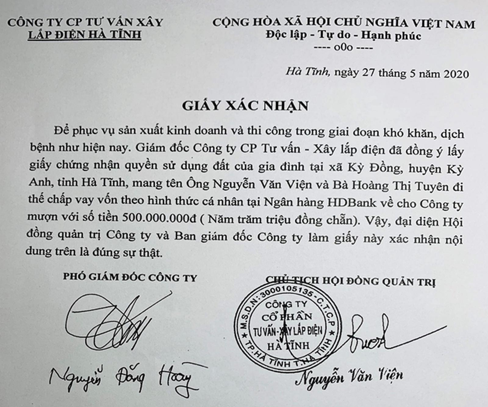 Về số tiền 500 triệu đồng vay tại Ngân hàng Thương mại Cổ phần Phát triển TP Hồ Chí Minh từ thế chấp 01 GCNQSDĐ của ông Viện, bà Nguyễn Thị Mông Lân, thành viên HĐQT, Kế toán trưởng thừa nhận, từ tháng 6/2020 đến nay, công ty vẫn trả tiền lãi vay cho ngân hàng.