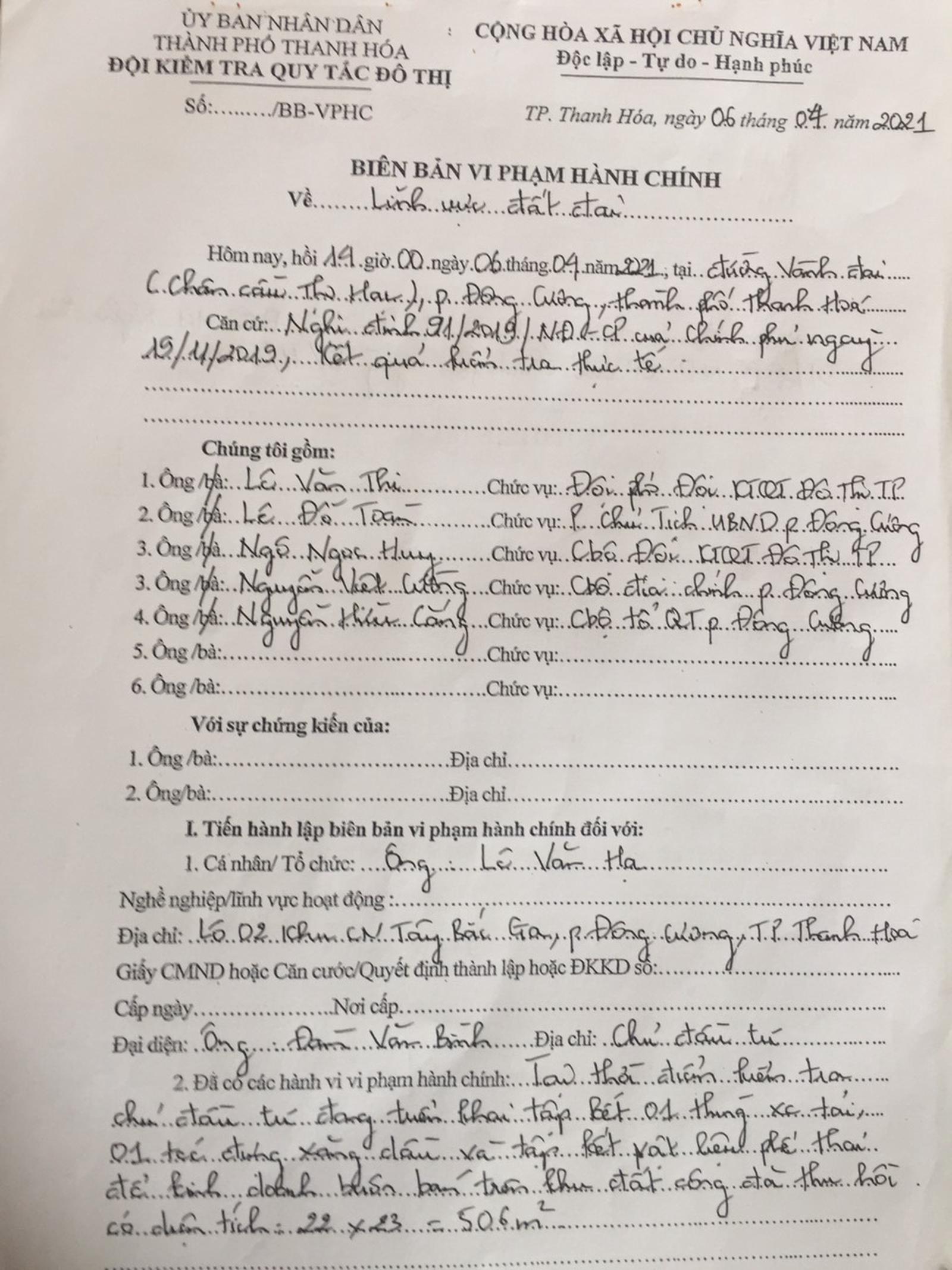 Được biết, ngày 6/4/2021 Quy tắc Đô thị TP Thanh Hóa đã phối hợp với UBND phường Đông Cương kiểm tra, lập biên bản xi phạm hành chính đối với hộ gia đình ông Lê Văn Hạ. Tại thời điểm kiểm tra, chủ đầu tư đang triển khai tập kết 1 thùng xe tải, 1 téc đựng xăng dầu và tập kết vật liệu phế thải để kinh doanh, buôn bán trên đất công của Nhà nước với diện tích 506m2. Đoàn kiểm tra cũng yêu cầu gia đình ông Lê Văn Hạ di chuyển toàn bộ những cơ sở vật chất đã vi phạm trên đất công, trả lại nguyên trạng bạn đầu của đất. Thế nhưng, đến nay việc vi phạm này vẫn tái diễn và gia chủ vẫn coi thường pháp luật.