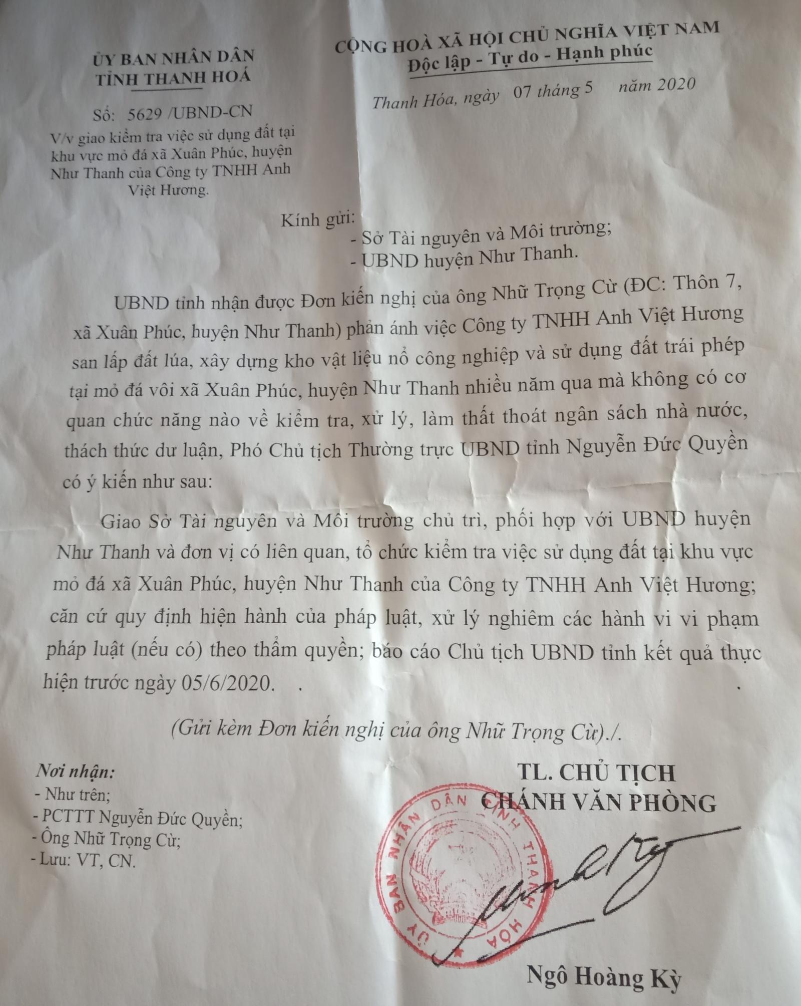 Được biết, ngày 07/5/2020 UBND tỉnh Thanh Hóa đã có chỉ đạo giao cho Sở Tài Nguyên và Môi trường chủ trì phối hợp với UBND huyện Như Thanh và các đơn vị có liên quan tổ chức việc sử dụng đất tại khu vực mỏ đá xã Xuân Phúc của Công ty Anh Việt Hương. Theo đó, căn cứ vào các quy định hiện hành của pháp luật, xử lý nghiêm các hành vi vi phạm theo thẩm quyền, báo cáo UBND tỉnh trước ngày 5/6/2020.