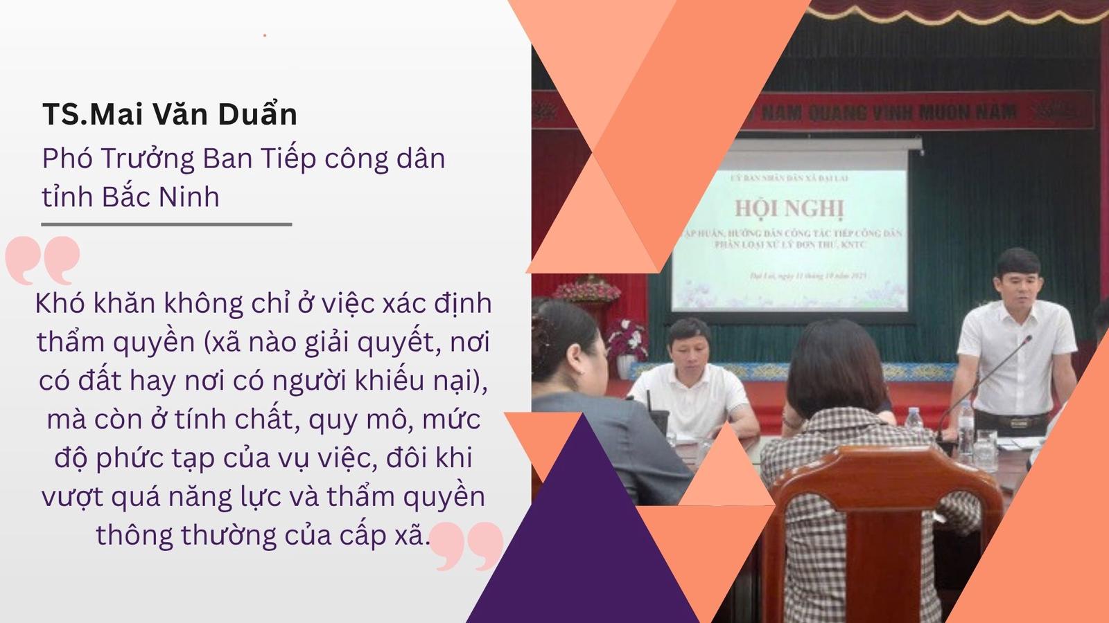 "Khó khăn không chỉ ở việc xác định thẩm quyền (xã nào giải quyết, nơi có đất hay nơi có người khiếu nại), mà còn ở tính chất, quy mô, mức độ phức tạp của vụ việc, đôi khi vượt quá năng lực và thẩm quyền thông thường của cấp xã", TS. Duẩn nhấn mạnh.