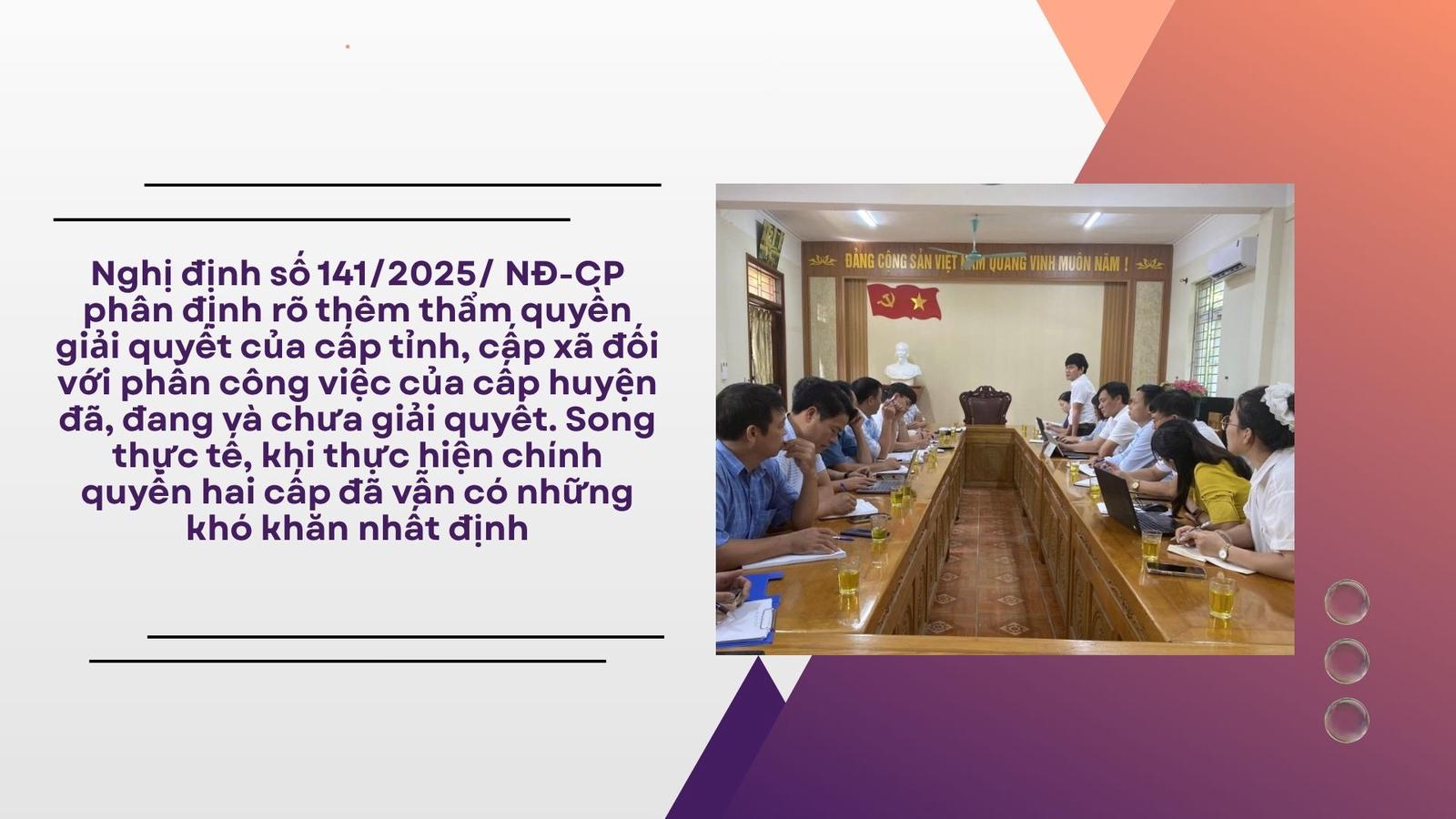 Việc phân định thẩm quyền giải quyết khiếu nại, tố cáo trong các văn bản pháp luật hiện hành đã khá rõ ràng. Về cơ bản vẫn dựa theo nguyên tắc xác định thẩm quyền mà Luật Tiếp công dân, Luật Khiếu nại, Luật Tố cáo đã quy định, Nghị định số 141/2025/ NĐ-CP phân định rõ thêm thẩm quyền giải quyết của cấp tỉnh, cấp xã đối với phần công việc của cấp huyện đã, đang và chưa giải quyết. Song thực tế, khi thực hiện chính quyền 2 cấp đã vẫn có những khó khăn nhất định.