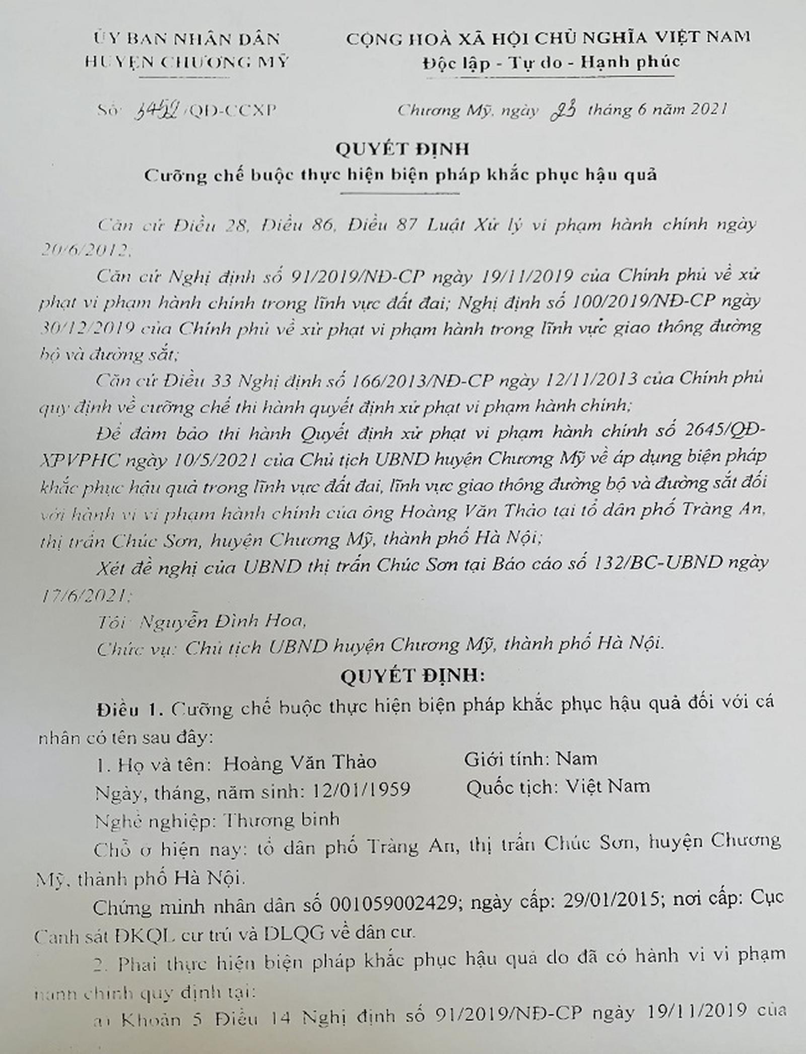 Ngày 23/6/2021, UBND huyện Chương Mỹ ban hành Quyết định số 3452 cưỡng chế buộc thực hiện biện pháp khắc phục hậu quả và yêu cầu ông Thảo phải thực hiện sau 15 ngày kể từ ngày nhận được quyết định.