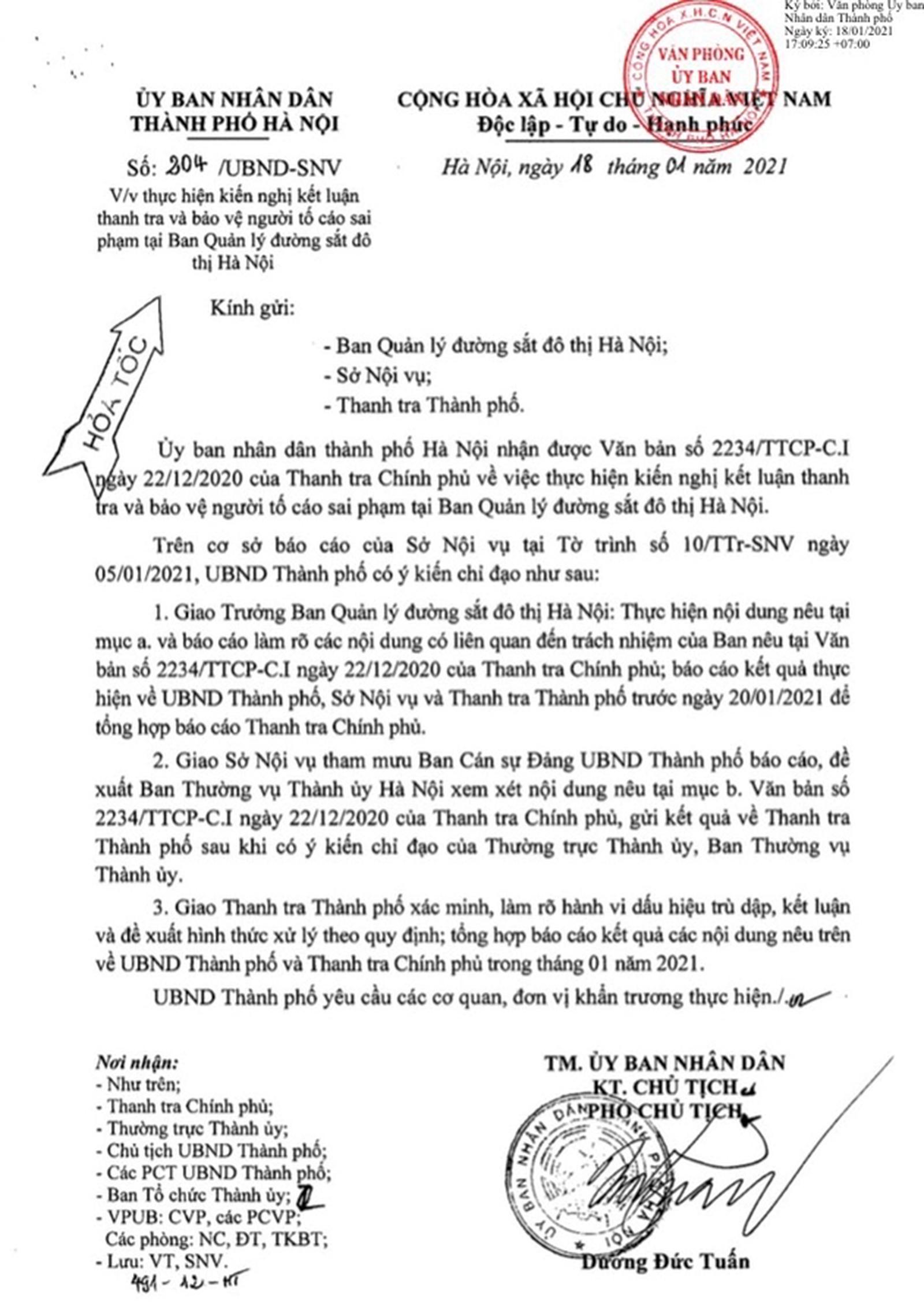 Ngày 18/01/2021, UBND TP tiếp tục có Văn bản số 204 giao Trưởng BQL Đường sắt đô thị Hà Nội thực hiện nội dung tại mục a và báo cáo làm rõ nội dung có liên quan đến trách nhiệm của Ban nêu tại Văn bản 2234; giao Sở Nội vụ tham mưu Ban Cán sự Đảng UBND TP báo cáo đề xuất Ban Thường vụ Thành ủy Hà Nội xem xét nội dung nêu tại mục b. Văn bản 2234; giao Thanh tra thành phố xác minh, làm rõ hành vi dấu hiệu trù dập, kết luận và đề xuất hình thức xử lý theo quy định.