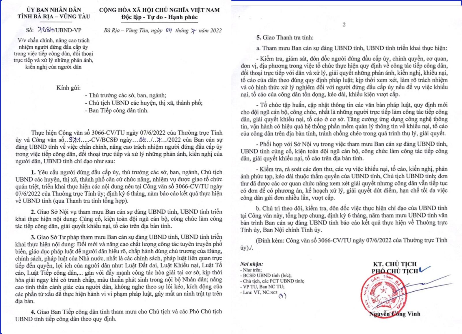 UBND tỉnh Bà Rịa - Vũng Tàu yêu cầu người đứng đầu cấp ủy, thủ trưởng các sở, ban, ngành, chủ tịch UBND các huyện, thị xã, thành phố căn cứ chức năng, nhiệm vụ được giao tổ chức quán triệt, triển khai các nội dung nêu tại Công văn số 3066-CV/TU ngày 7/6/2022 của Thường trực Tỉnh ủy về việc chấn chỉnh, nâng cao trách nhiệm người đứng đầu cấp ủy trong việc tiếp công dân, đối thoại trực tiếp và xử lý những phản ánh kiến nghị của người dân; định kỳ 6 tháng, năm báo cáo kết quả thực hiện về UBND tỉnh (qua Thanh tra tỉnh tổng hợp).