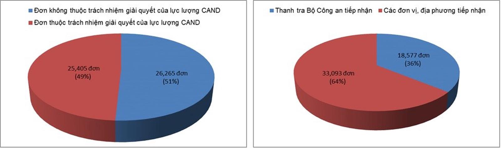 Trong công tác tiếp nhận, xử lý đơn, Công an các cấp tiếp nhận 51.670 đơn các loại (tăng 11.802 đơn so với cùng kỳ năm trước); trong đó, lãnh đạo Bộ Công an chỉ đạo Thanh tra Bộ Công an tiếp nhận 18.577 đơn (chiếm 35,95% tổng số đơn toàn lực lượng), tăng 4.444 đơn so với cùng kỳ năm trước.