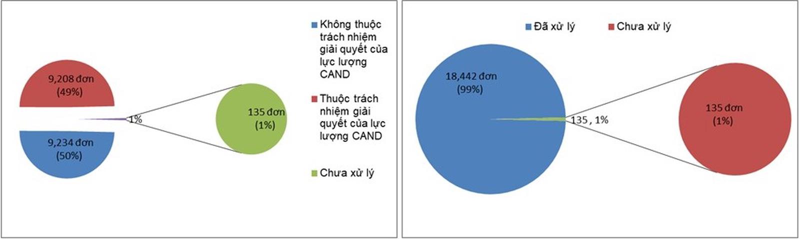 Kết quả, đã chuyển, hướng dẫn công dân gửi 26.263 đơn không thuộc trách nhiệm giải quyết của lực lượng CAND đến các cơ quan, người có thẩm quyền xem xét, giải quyết; xử lý, giải quyết 18.712/19.596 đơn thuộc trách nhiệm của lực lượng Công an (không tính 5.809 đơn trùng nội dung), đạt 95,48%.