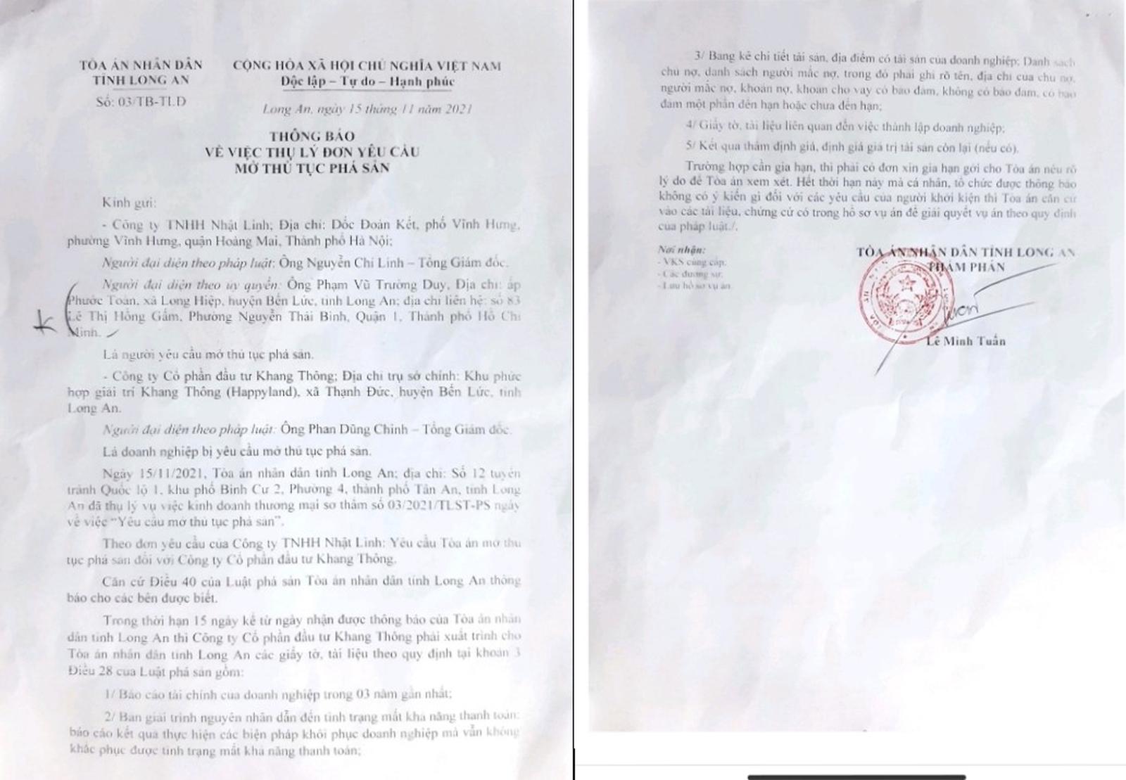 Trước đó, TAND tỉnh Long An có Thông báo số 03 ngày 15/11/2021, gửi Công ty LIOA và Công ty Khang Thông thông báo về việc thụ lý đơn yêu cầu mở thủ tục phá sản đối với Công ty Khang Thông.
