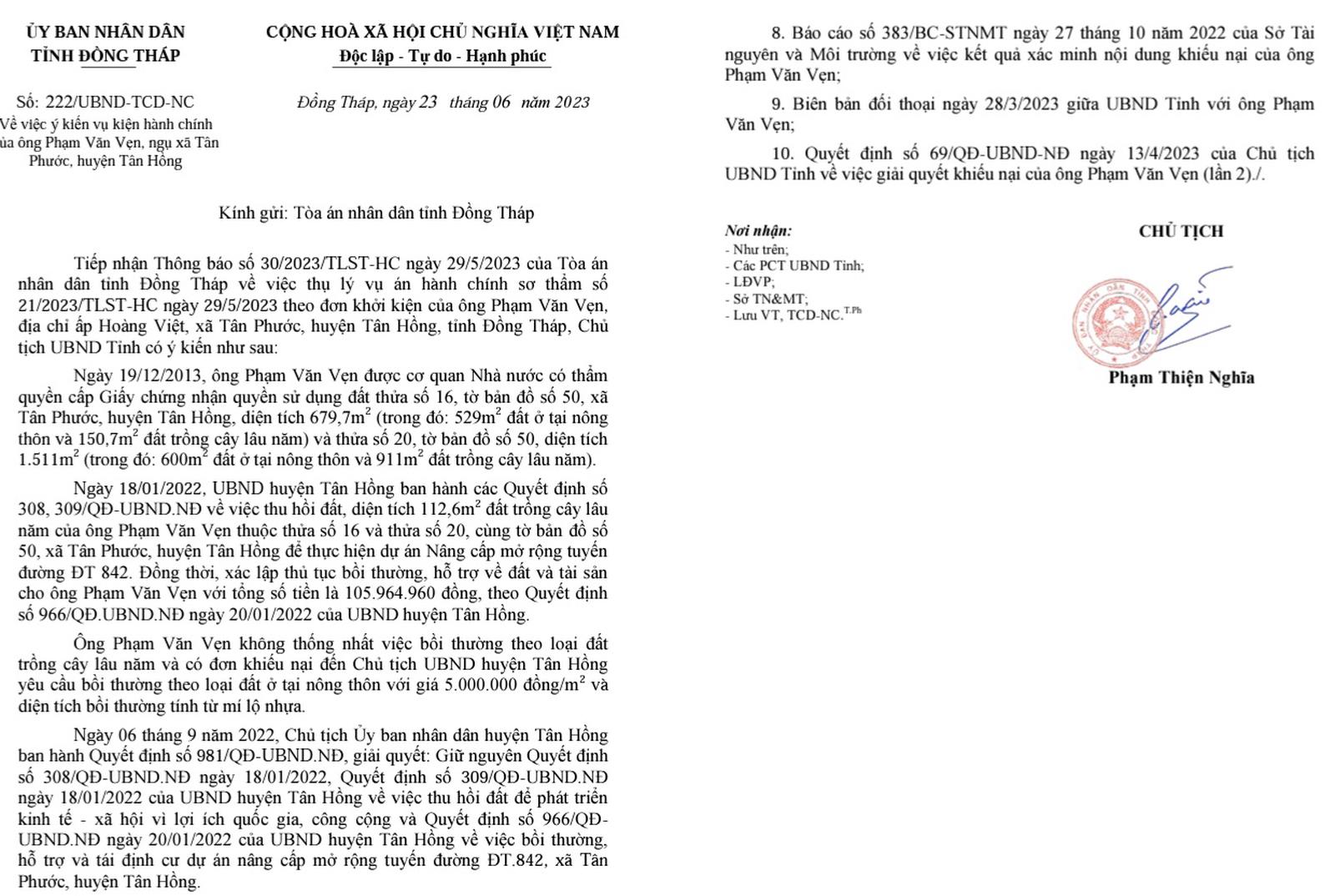 Tại Văn bản số 222/UBND-TCD-NC gửi TAND tỉnh, Chủ tịch UBND tỉnh Đồng Tháp Phạm Thiện Nghĩa có ý kiến: “Ông Phạm Văn Vẹn khởi kiện, yêu cầu TAND tỉnh huỷ Quyết định số 69/QĐ-UBND-NĐ ngày 13/4/2023 của Chủ tịch UBND tỉnh, là không có cơ sở”.