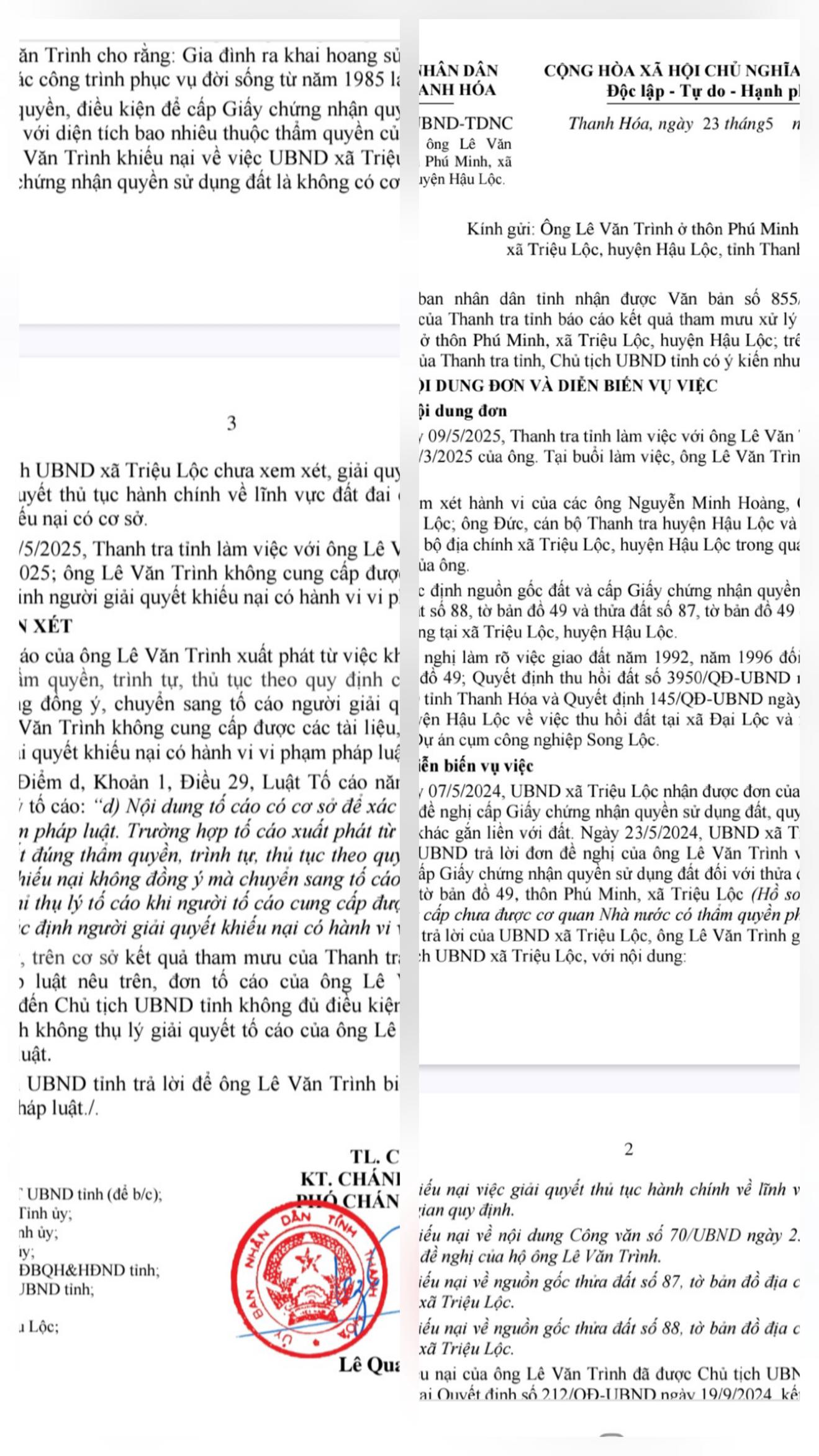Ngày 9/5/2025, Thanh tra tỉnh Thanh Hóa làm việc với ông Lê Văn Trình về nội đơn đề ngày 29/3/2025; ông Lê Văn Trình không cung cấp được các tài liệu, chứng cứ để chứng minh người giải quyết khiếu nại có hành vi vi phạm pháp luật.