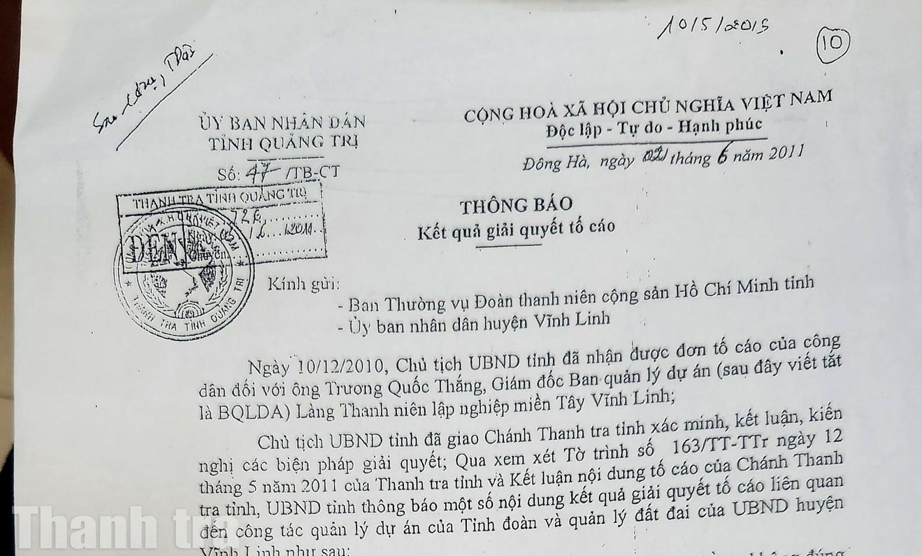 Thông báo số 47/TB-CT do Chủ tịch UBND tỉnh Quảng Trị ban hành ngày 2/6/2011, nêu rõ về các sai phạm trong quản lý, sử dụng đất tại Làng TNLN miền Tây Vĩnh Linh: Cán bộ Ban quản lý (BQL) Dự án Làng TNLN được phân chia hàng chục héc ta đất trái đối tượng; nhiều hộ không thuộc diện thanh niên lập nghiệp vẫn được bố trí đất ở, đất sản xuất; Thông báo 47 cũng yêu cầu Ban Thường vụ Tỉnh đoàn – cơ quan chủ trì dự án bàn giao hạ tầng, phúc lợi cho địa phương và chấn chỉnh các sai sót; đồng thời giao UBND Vĩnh Linh (cũ) rà soát, xử lý việc cấp đất sai đối tượng.