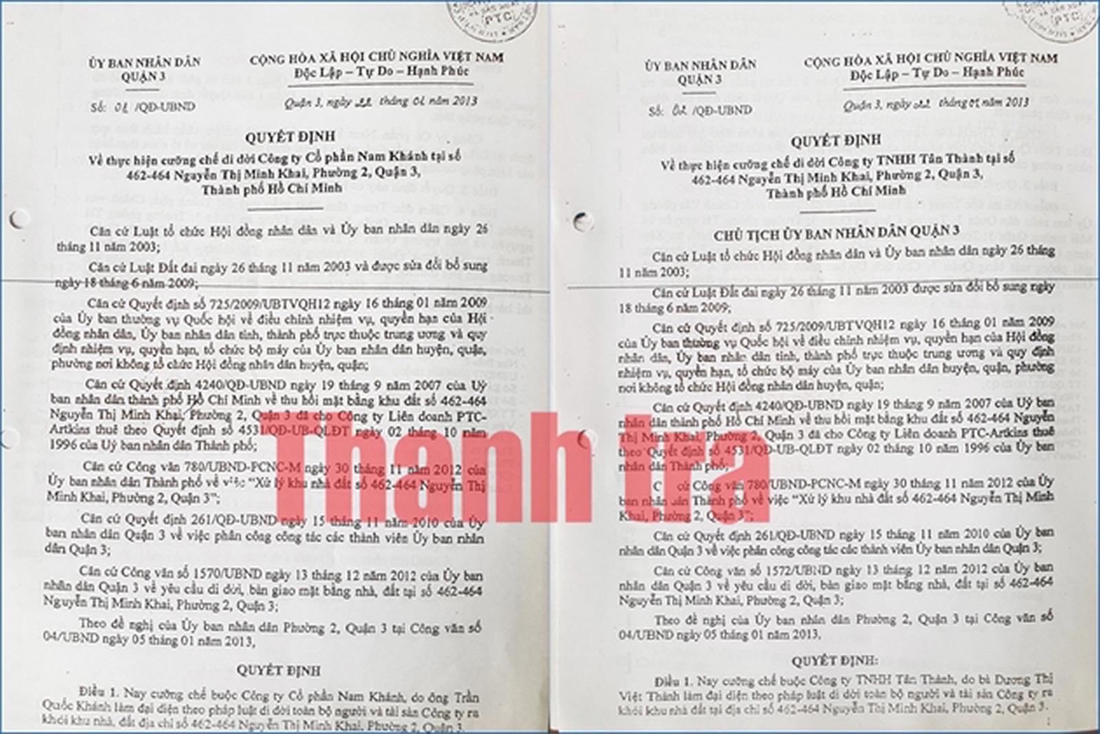 Văn bản số 708/UBND của UBND quận 3 khẳng định: “Công ty Cổ phần Nam Khánh và Công ty TNHH Tân Thành không có bất kỳ quyền gì trên khu nhà đất số 462 - 464 Nguyễn Thị Minh Khai, phường 2, quận 3 nhưng có nghĩa vụ ra khỏi nơi này vô điều kiện vì đã chiếm dụng bất hợp pháp”.