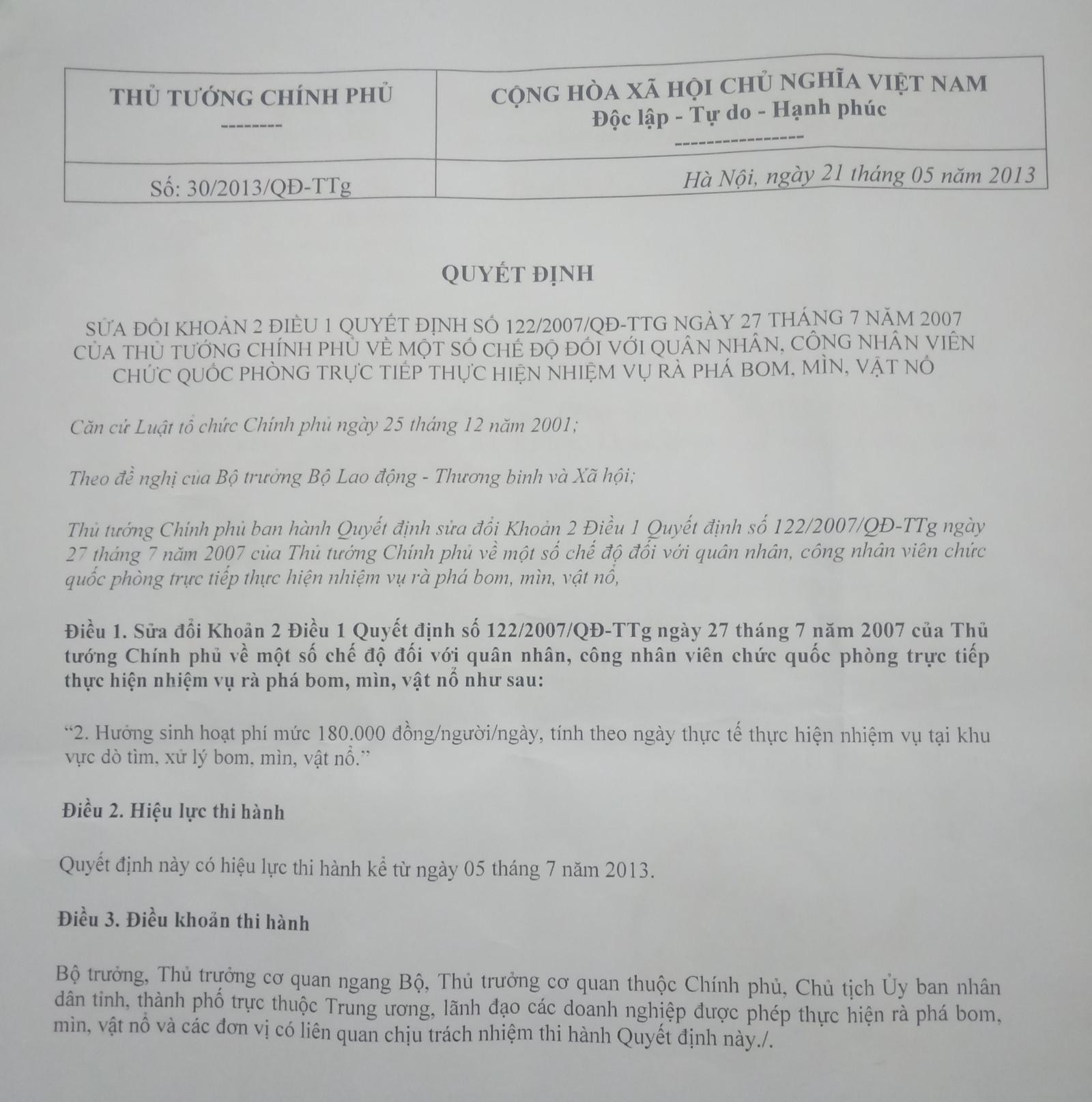Hiện nay chưa có quyết định nào thay thế cho Quyết định số 30/2013/QĐ-TTg của Thủ tướng Chính phủ, thế nhưng trên địa bàn tỉnh Thanh Hóa đã xuất hiện tình trạng một số chủ đầu tư tự ý chỉ định gói thầu rà phá bom mìn cho các đơn vị, doanh nghiệp có giấy phép rà phá bom mìn nhưng mức hưởng sinh hoạt phí cao hơn so với Quyết định số 30 của Thủ tướng, gây tăng chi phí dẫn đến tăng ngân sách làm thất thoát, lãng phí tiền Nhà nước khó hiểu.