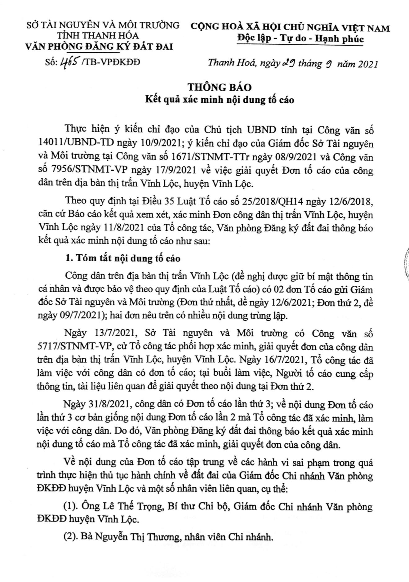 Thông báo kết quả xác minh đơn thư tố cáo đối với vụ việc ở Chi nhánh Văn phòng đăng ký đất đai huyện Vĩnh Lộc. Ảnh: VT