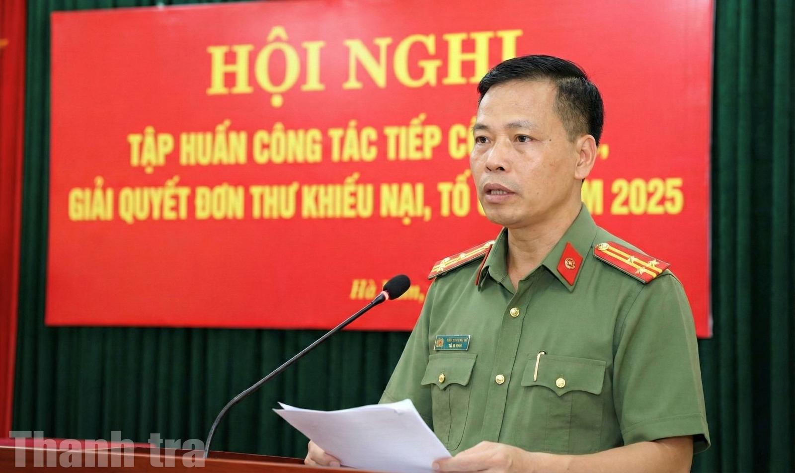Thượng tá Phạm Đồng Điện, Chánh Thanh tra Công an tỉnh Ninh Bình tại Hội nghị tập huấn công tác tiếp công dân, giải quyết đơn thư khiếu nại, tố cáo. Ảnh: Thái Minh