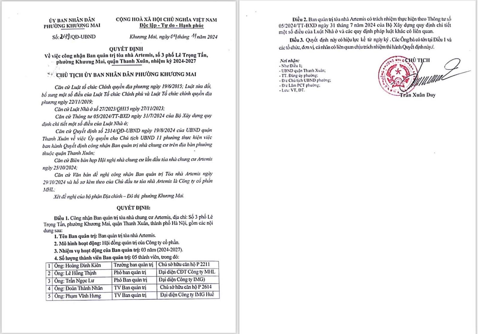 UBND Phường Khương Mai ban bành quyết định công nhận ban quản trị tòa nhà Artrmis