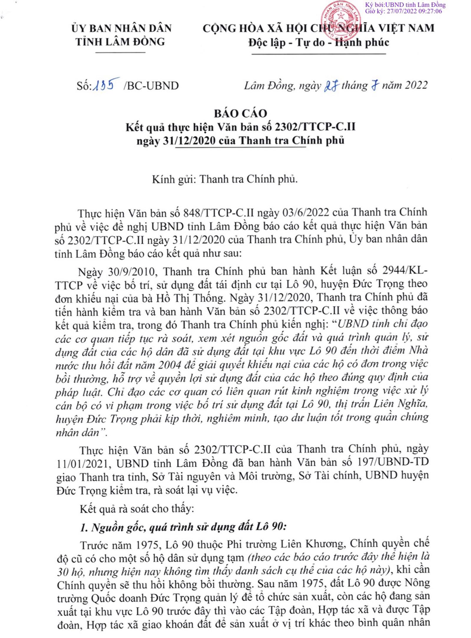 Báo cáo số 135/BC-UBND ngày 27/7/2022 của UBND tỉnh Lâm Đồng. Ảnh: TQ