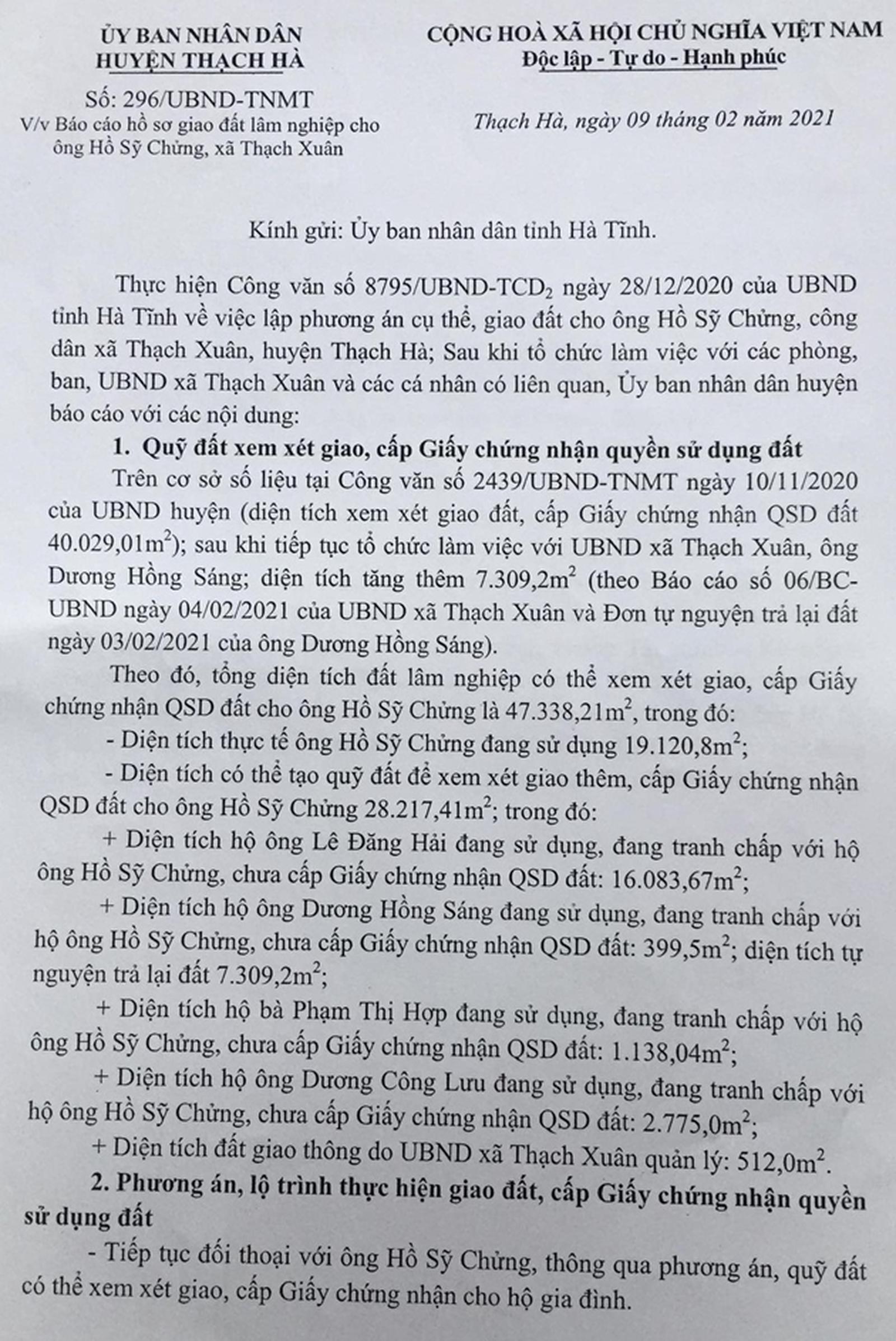 Thực hiện Văn bản số 8795 ngày 28/12/2020 của UBND tỉnh về việc lập phương án cụ thể, giao đất cho ông Hồ Sỹ Chửng, xã Thạch Xuân, ngày 9/2/2021, UBND huyện Thạch Hà có Văn bản số 296 về việc báo cáo hồ sơ giao đất lâm nghiệp cho ông Hồ Sỹ Chửng gửi UBND tỉnh.