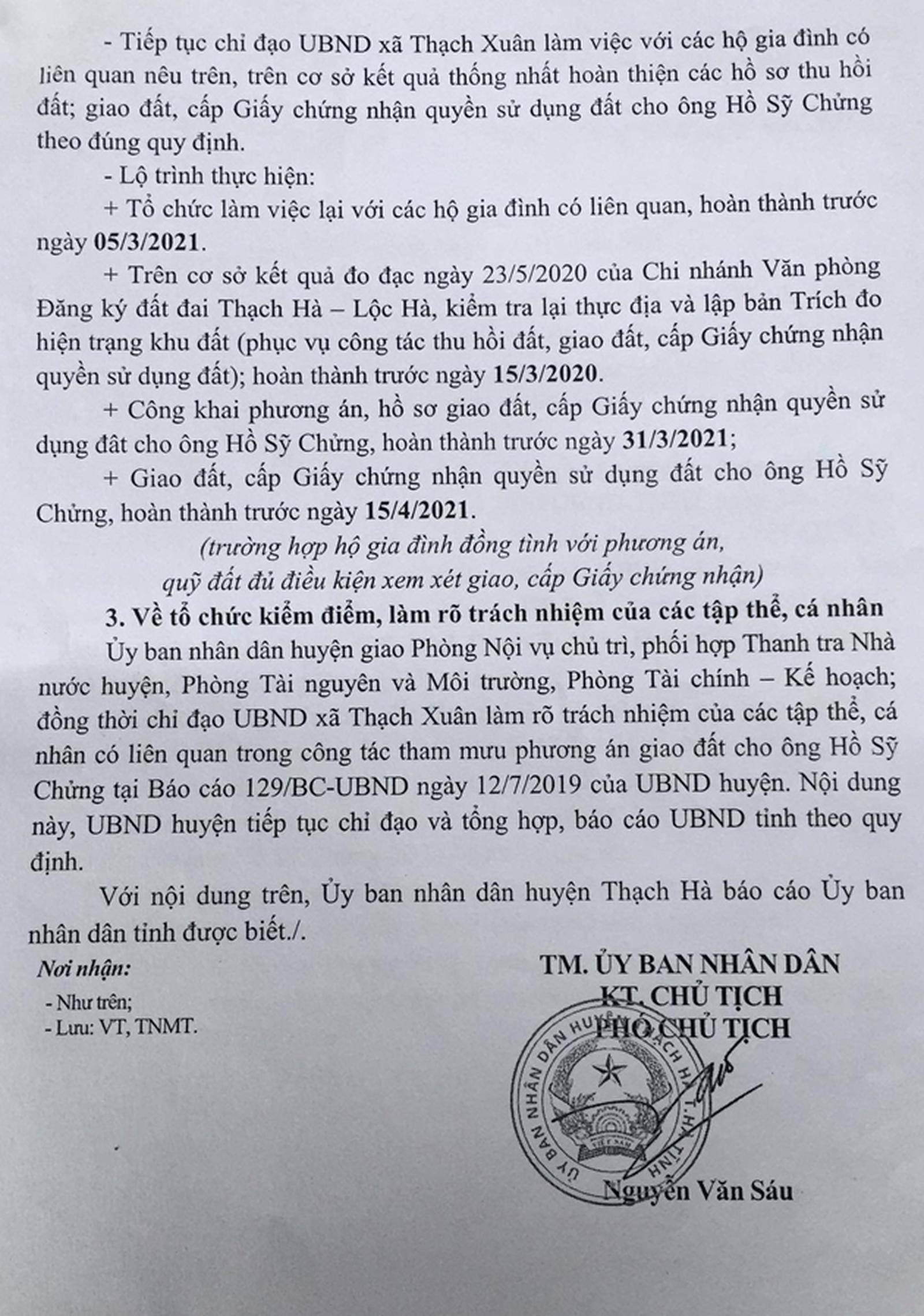 UBND huyện Thạch Hà đặt ra lộ trình thực hiện kéo dài đến ngày 15/4/2021, cụ thể: Tổ chức làm việc với các hộ gia đình liên quan, hoàn thành trước ngày 5/3/2021; kiểm tra lại thực địa và lập trích đo hiện trạng khu đất hoàn thành trước ngày 15/3/2021; công khai phương án, hồ sơ giao đất, cấp GCNQSDĐ cho ông Hồ Sỹ Chửng, hoàn thành trước ngày 31/3/2021; giao đất, cấp GCNQSDĐ cho ông Chửng, hoàn thành trước ngày 15/4/2021.