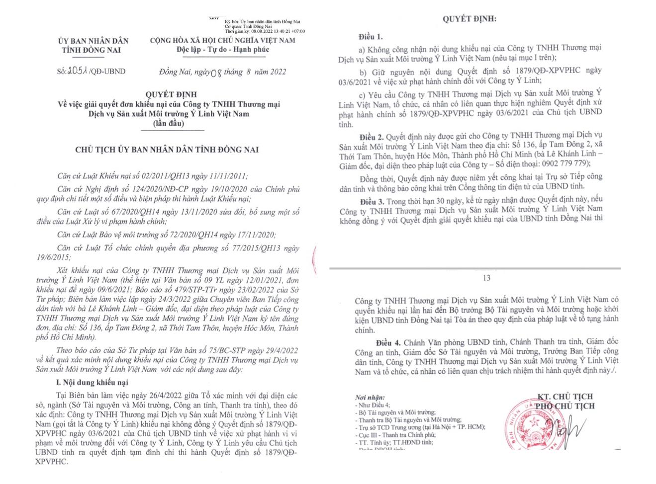 Tại Quyết định số 2051/QĐ-UBND về việc giải quyết đơn khiếu nại của Công ty Ý Linh, căn cứ kết quả xác minh nội dung khiếu nại, kết quả đối thoại và kết luận, Chủ tịch UBND tỉnh Đồng Nai quyết định: Không công nhận nội dung khiếu nại của Công ty Ý Linh; giữ nguyên nội dung Quyết định số 1879/QĐ-XPVPHC ngày 3/6/2021 về việc xử phạt hành chính đối với Công ty Ý Linh.