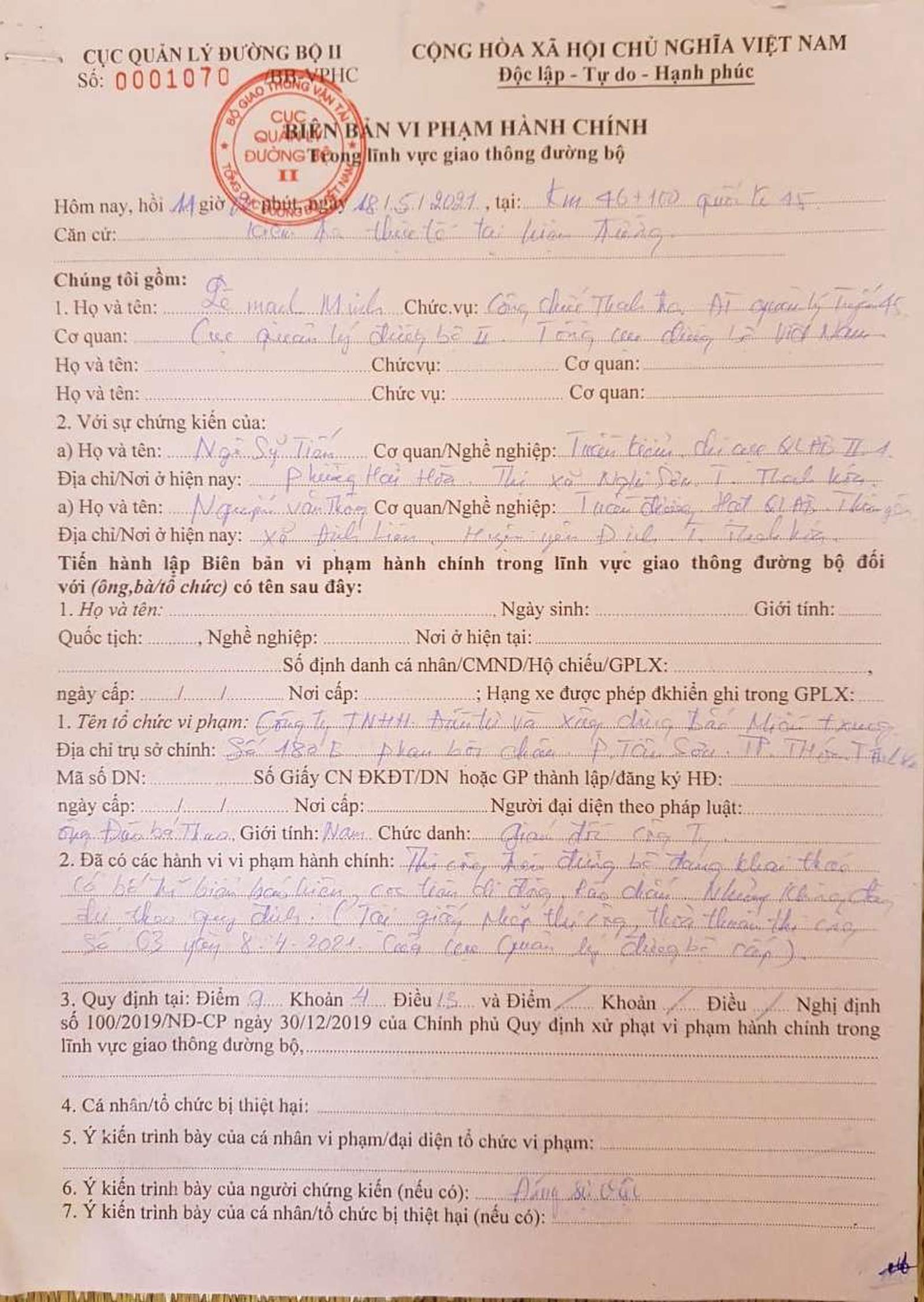 Cụ thể, vi phạm hành chính trong lĩnh vực giao thông đường bộ do Cục Quản lý đường bộ II lập: Vào lúc 11h ngày 18/5/2021, tại Km 46+100 Ql 45, qua kiểm tra thực tế tại hiện trường, đơn vị thi công đã có hành vi vi phạm hành chính thi công trên đường bộ đang khai thác có bố trí cọc báo hiệu, rào chắn nhưng không đầy đủ theo quy định là vi phạm Điểm 9 Khoản 5 Điều 13 Nghị định số 100/2019/NĐ-CP ngày 30/12/2019, của Chính phủ Quy định về xử lý vi phạm hành chính trong lĩnh vực giao thông đường bộ.