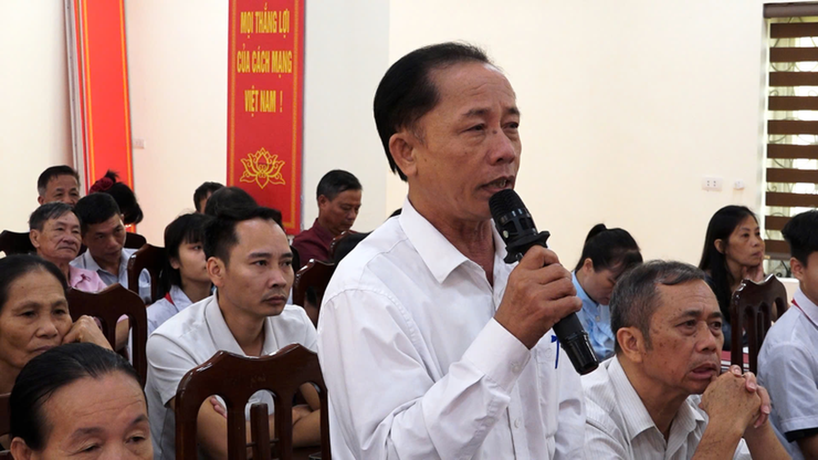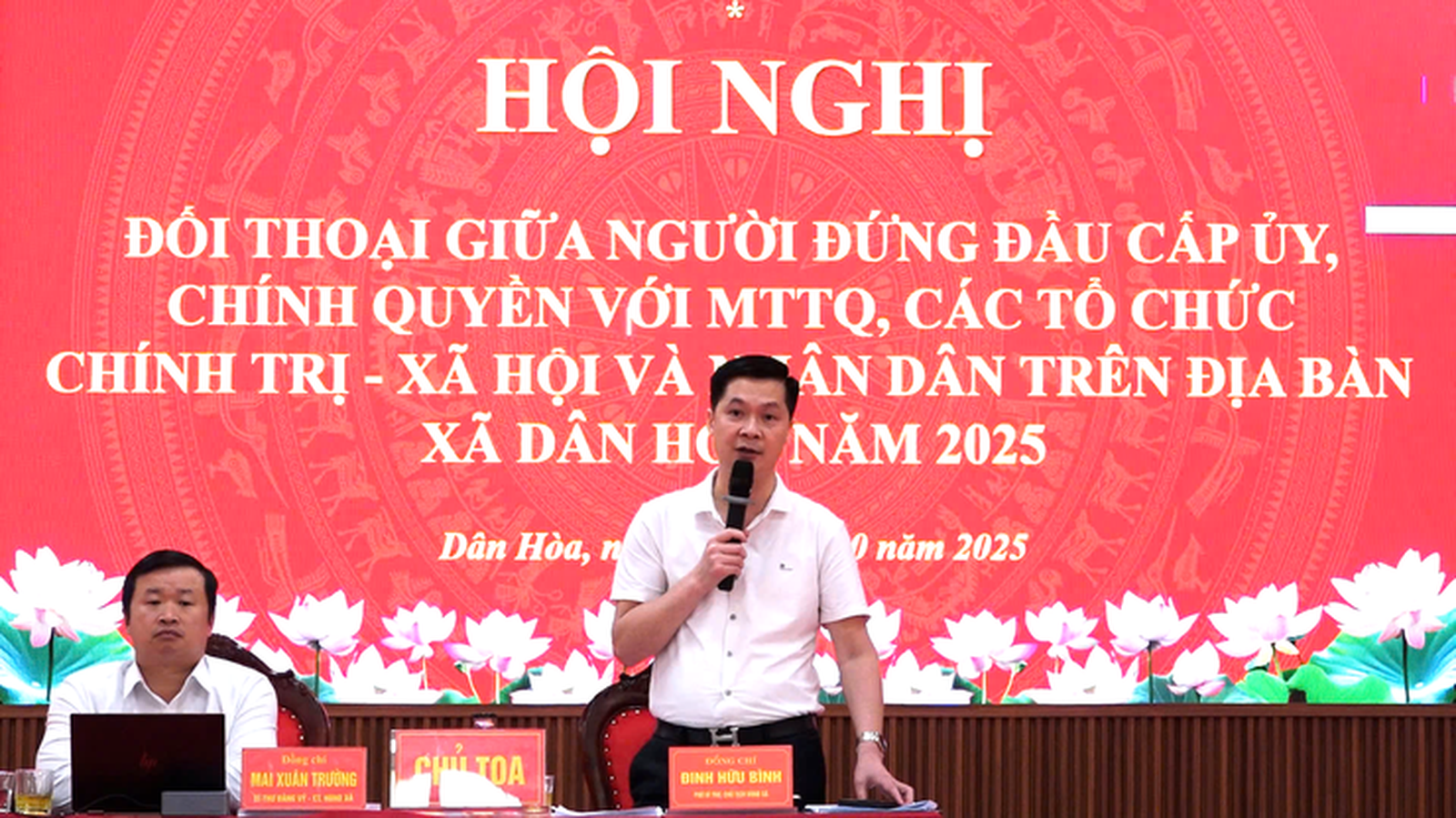 Chủ tịch UBND xã Dân Hoà trả lời các kiến nghị của người dân tại buổi đối thoại với Nhân dân trên địa bàn xã. Ảnh: Đỗ Phong