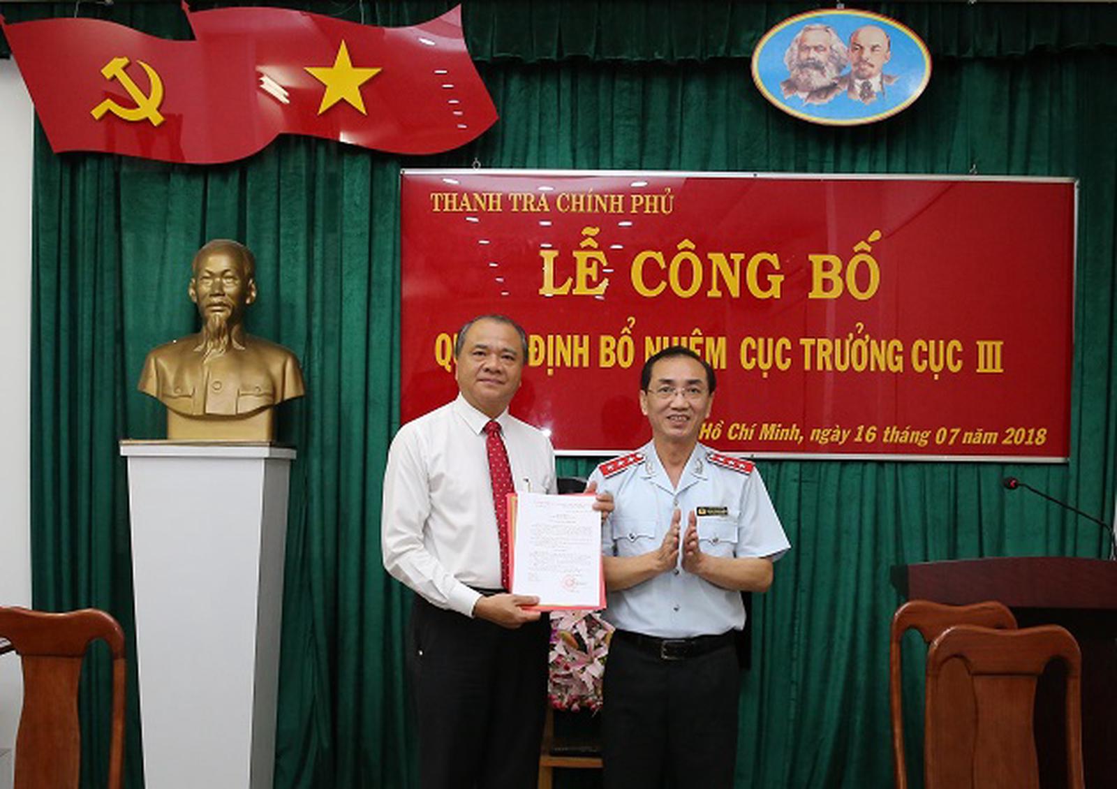 Phó Tổng Thanh tra Chính phủ Đặng Công Huẩn trao Quyết định cho ông Trần Văn Mây giữ chức Cục trưởng Cục Thanh tra, Giải quyết khiếu nại, tố cáo khu vực 3 (Cục III). Ảnh: Mạnh Hùng