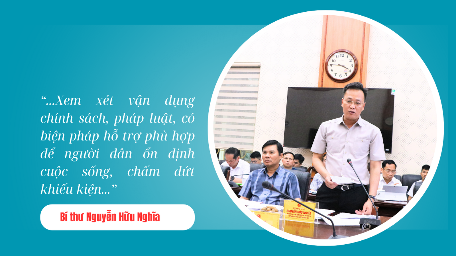 Theo chỉ đạo của Tổ trưởng Nguyễn Hữu Nghĩa, việc xử lý phải dựa trên nguyên tắc: “Giải quyết đúng pháp luật nhưng cũng phải hợp lý, hợp tình”. Trường hợp phát hiện việc giải quyết trước đó chưa đúng quy định, các cơ quan có trách nhiệm phải rà soát, sửa sai, xử lý trách nhiệm cá nhân liên quan. Nếu việc giải quyết đúng pháp luật nhưng chưa thấu đáo, ảnh hưởng quyền lợi người dân, đặc biệt là các hộ có hoàn cảnh khó khăn, lãnh đạo địa phương cần vận dụng chính sách hỗ trợ phù hợp, ổn định cuộc sống cho người dân để chấm dứt khiếu kiện.