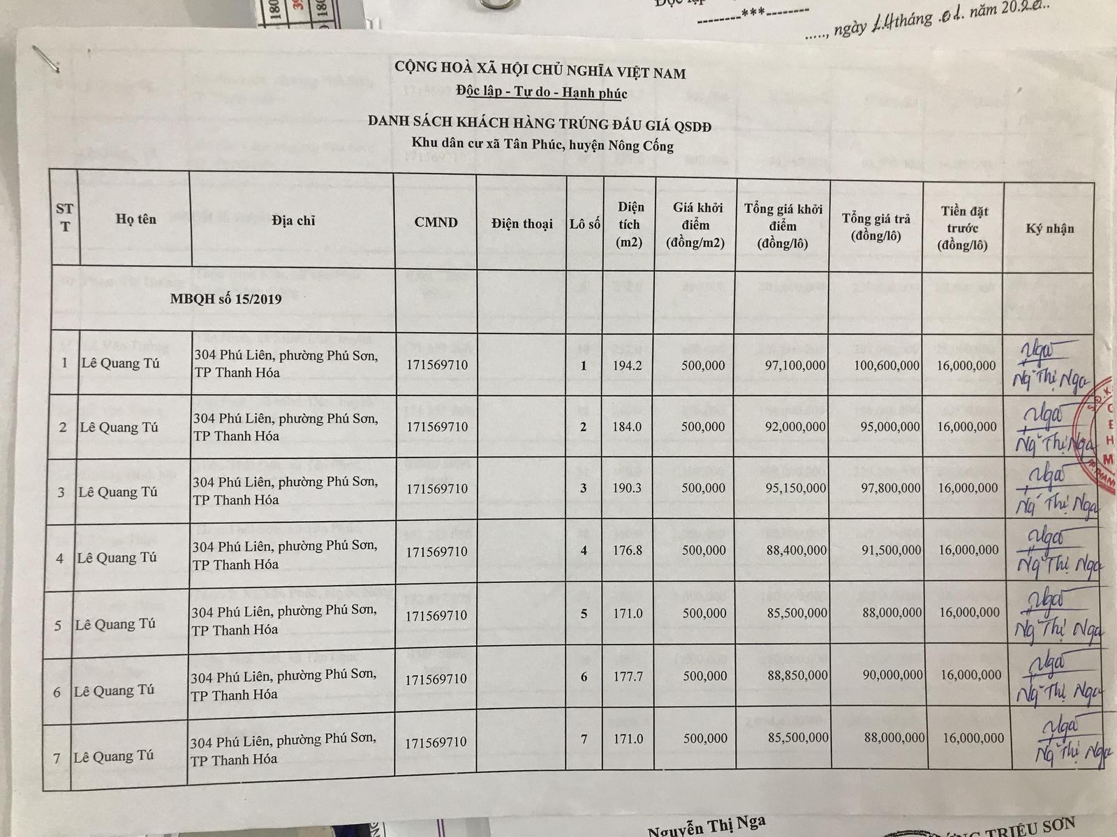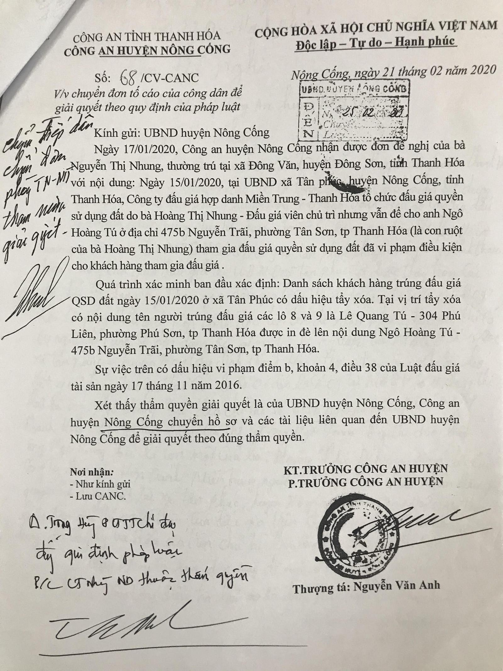 Công an huyện Nông Cống đã tiến hành xác minh, ngày 21/2/2020 có Văn bản số 68/CV-CANC gửi đến UBND huyện Nông Cống nêu rõ: Quá trình xác minh ban đầu, danh sách khách hàng trúng đấu giá QSDĐ ngày 15/1/2020 ở xã Tân Phúc có dấu hiệu tẩy xóa. Tại vị trí tẩy xóa có nội dung tên người trúng đấu giá các lô 8 và 9 là Lê Quang Tú, 304 Phú Liên, phường Phú Sơn, TP Thanh Hóa được in đè nội dung Ngô Hoàng Tú, 475b Nguyễn Trãi, phường Tân Sơn, TP Thanh Hóa. Sự việc trên có dấu hiệu vi phạm điểm b, khoản 4, điều 38 của Luật Đấu giá ngày 17/11/2016.