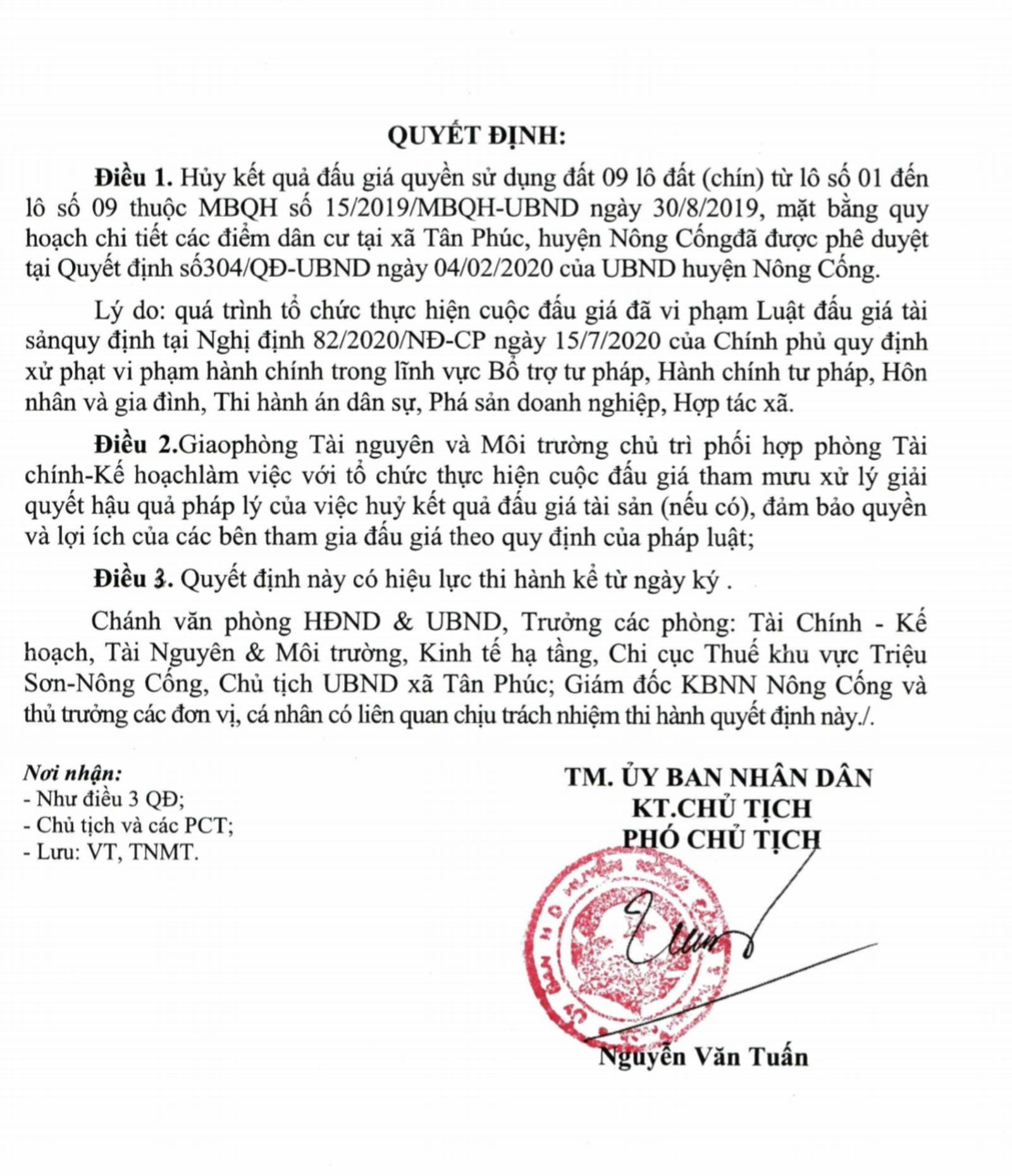 Theo đó, nội dung Điều 1 của Quyết định này là hủy kết quả trúng đấu giá 9 lô đất từ lô số 01 đến lô số 09 thuộc mặt bằng quy hoạch số 15/2019/MBQH-UBND ngày 30/8/2019, mặt bằng quy hoạch chi tiết các điểm dân cư tại xã Tân Phúc, huyện Nông Cống được phê duyệt tại Quyết định số 304/QĐ-UBND ngày 4/2/2020 của UBND huyện Nông Cống. Lý do hủy, quá trình tổ chức thực hiện cuộc đấu giá đã vi phạm Luật đấu giá tài sản quy định tại Nghị định 82/2020/NĐ-CP ngày 15/7/2020 của Chính phủ.