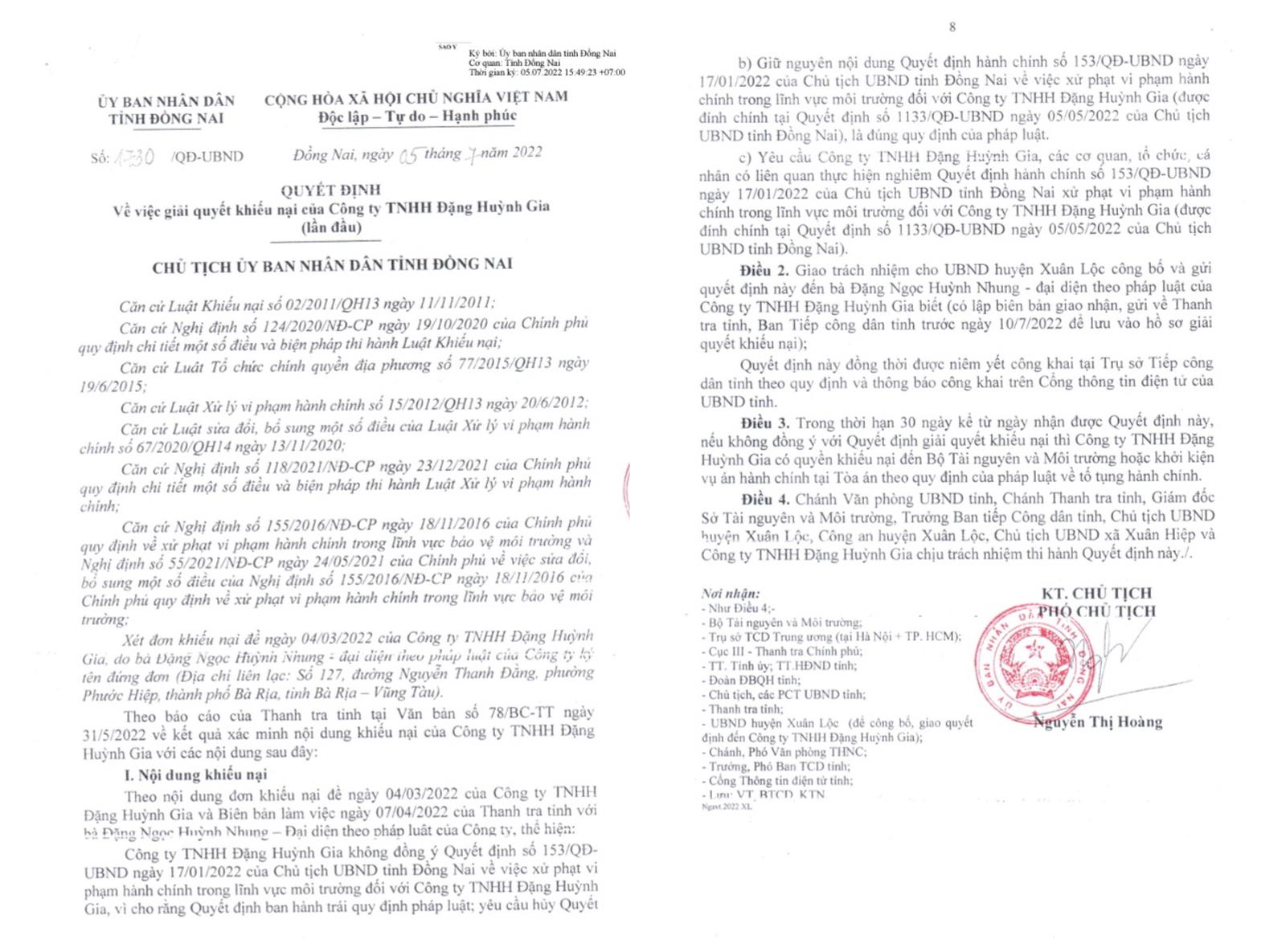 Sau khi xem xét nội dung khiếu nại, kết quả xác minh nội dung khiếu nại, kết quả đối thoại và kết luận, Chủ tịch UBND tỉnh Đồng Nai quyết định: Không công nhận nội dung đơn khiếu nại đề ngày 4/3/2022 của Công ty TNHH Đặng Huỳnh Gia; giữ nguyên Quyết định hành chính số 153/QĐ-UBND ngày 17/1/2022 của Chủ tịch UBND tỉnh Đồng Nai về việc xử phạt vi phạm hành chính trong lĩnh vực môi trường đối với Công ty TNHH Đặng Huỳnh Gia (được đính chính tại Quyết định số 1133/QĐ-UBND ngày 5/5/2022 của Chủ tịch UBND tỉnh Đồng Nai).