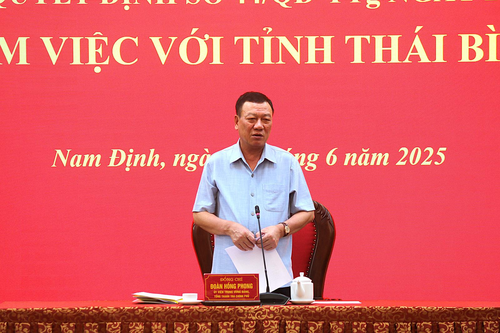 (Thanh tra) - Ngày 6/6, tại Nam Định, Tổ công tác của Thủ tướng Chính phủ (theo Quyết định số 44/QĐ-TTg ngày 28/3/2025) đã làm việc với tỉnh Thái Bình về vụ việc khiếu nại, tố cáo kéo dài, vượt cấp. Ông Đoàn Hồng Phong, Tổng Thanh tra Chính phủ, Tổ phó Thường trực của Tổ công tác chủ trì buổi làm việc.