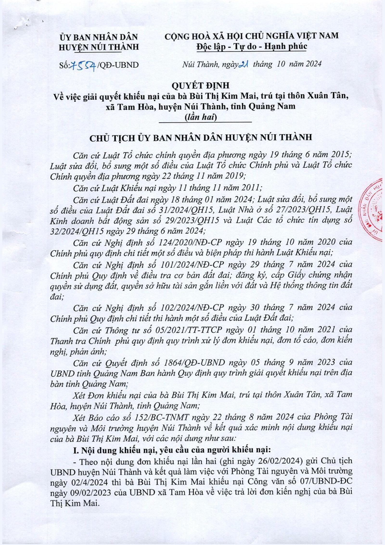 Vụ việc khiếu nại của bà Bùi Thị Kim Mai đã được Chủ tịch UBND xã Tam Hòa giải quyết khiếu nại lần đầu tại Quyết định số 24 ngày 29/1/2024 (gọi tắt là Quyết định số 24) nhưng bà Bùi Thị Kim Mai không đồng ý và tiếp tục khiếu nại lần hai đến Chủ tịch UBND huyện Núi Thành.