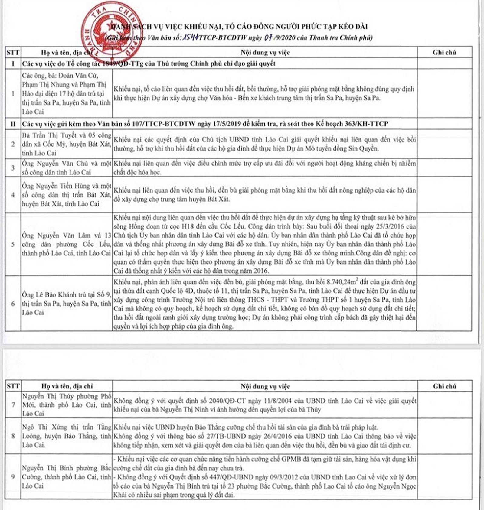 Đây là các vụ việc khiếu nại, tố cáo phức tạp kéo dài trong nhiều năm nay nhưng chưa được UBND tỉnh Lào Cai giải quyết dứt điểm dẫn đến phát sinh đơn thư khiếu nại, tố cáo vượt cấp kéo dài.