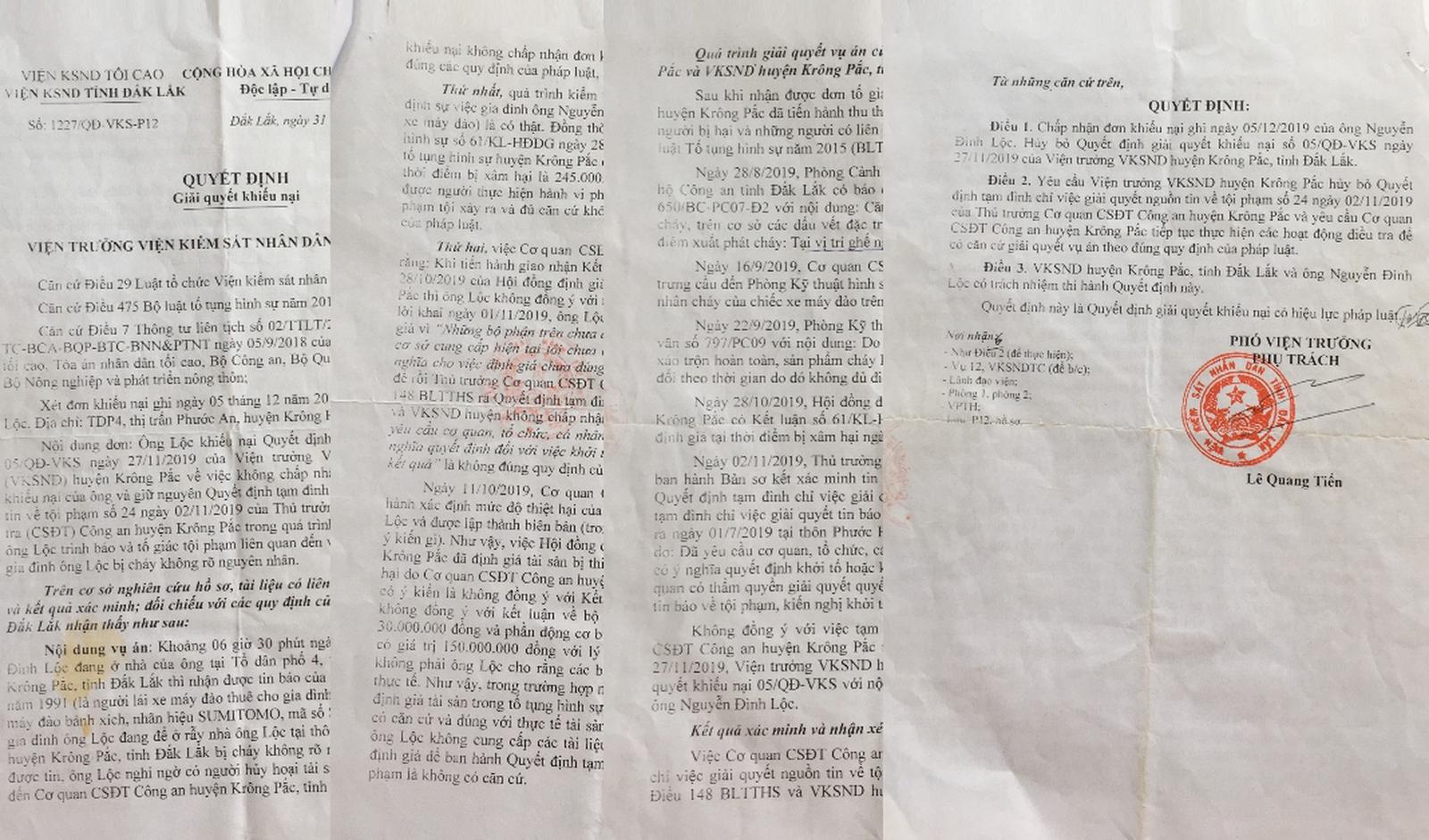 Căn cứ các lý do trên, Viện KSND tỉnh Đắk Lắk đã chấp nhận đơn khiếu nại đơn của ông Lộc; hủy bỏ Quyết định giải quyết khiếu nại số 05 ngày 27/11/2019 của Viện trưởng Viện KSND huyện Krông Pắc.