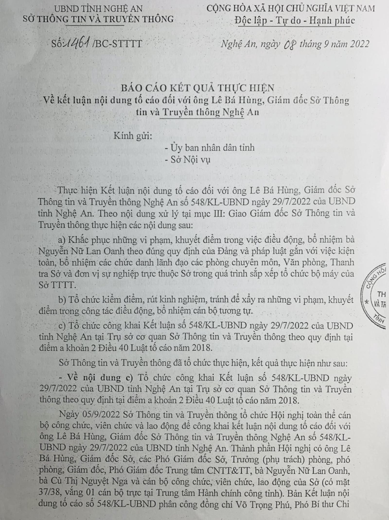 Trao đổi với PV về kết quả thực hiện Kết luận số 548/KL-UBND ngày 29/7/2022, ông Nguyễn Bá Hảo - Phó Giám đốc Sở TT&TT cho biết, ngày 8/9/2022, đơn vị đã có Văn bản số 1461 báo cáo kết quả thực hiện kết luận nội dung tố cáo đối với ông Lê Bá Hùng, Giám đốc Sở gửi UBND tỉnh và Sở Nội vụ.