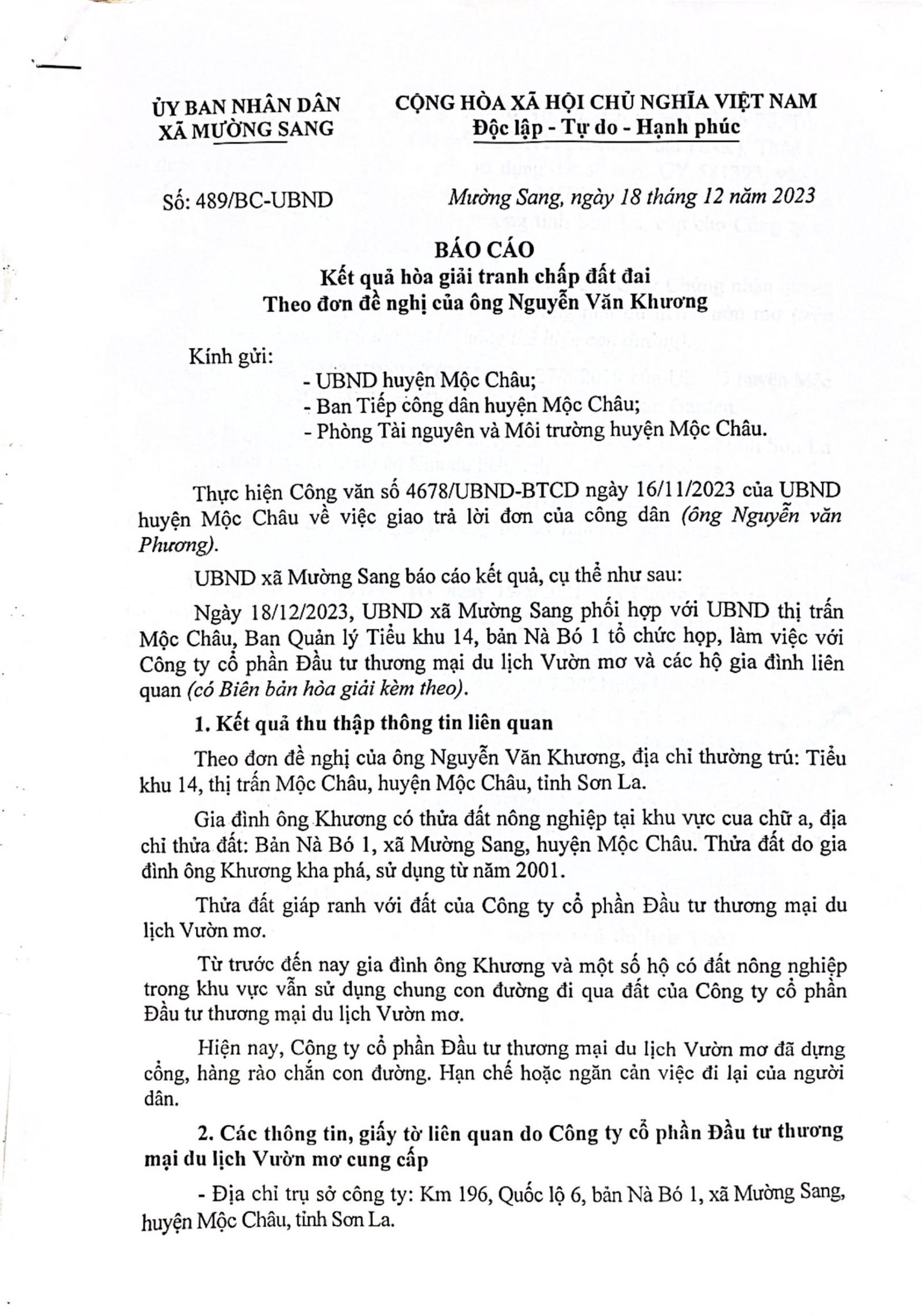 Cùng ngày 18/12/2023, UBND xã Mường Sang có Báo cáo số 489/BC-UBND về kết quả hòa giải tranh chấp đất đai theo đơn đề nghị của ông Nguyễn Văn Khương gửi UBND huyện Mộc Châu, Ban Tiếp công dân và Phòng Tài nguyên và Môi trường huyện Mộc Châu.