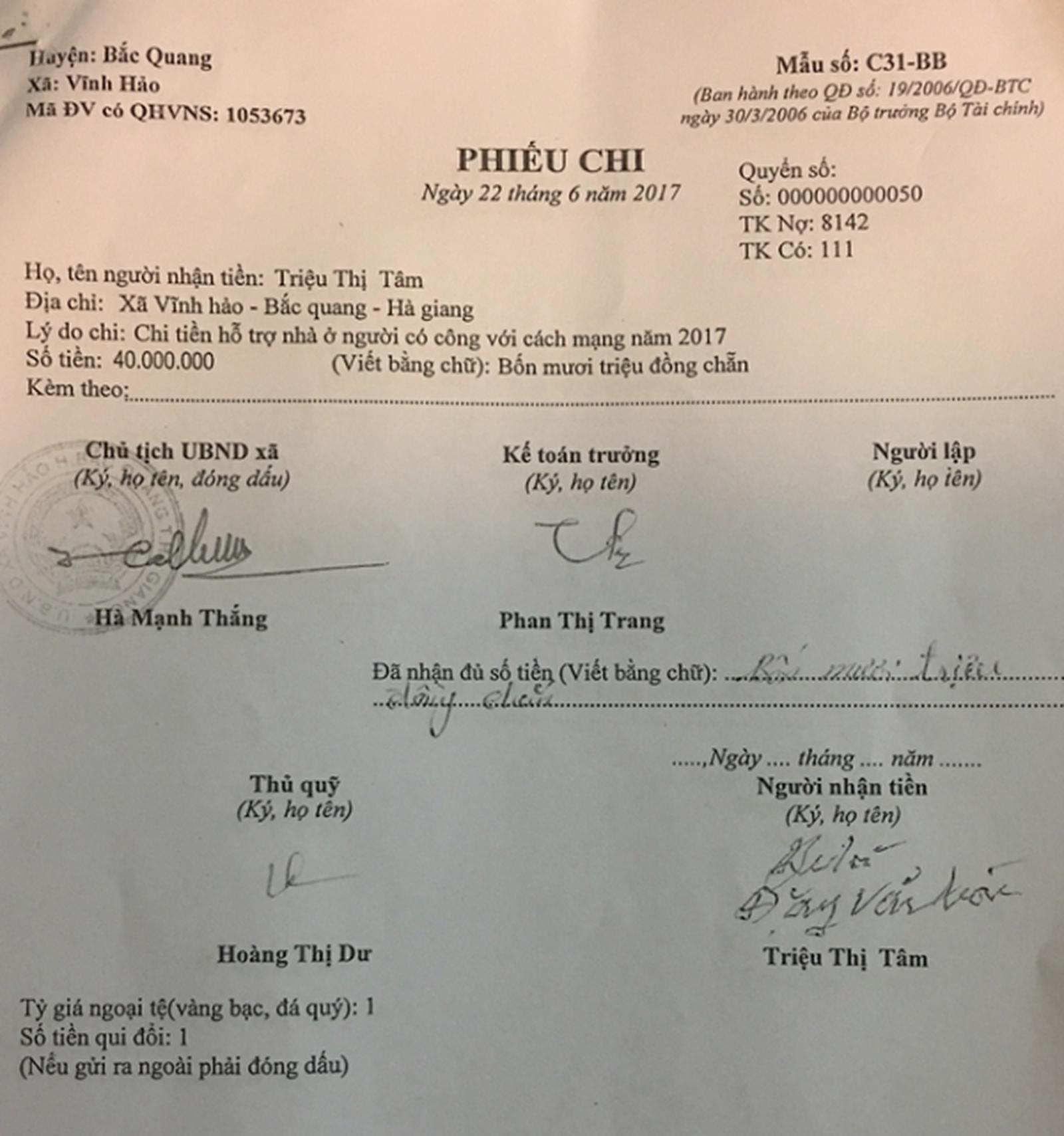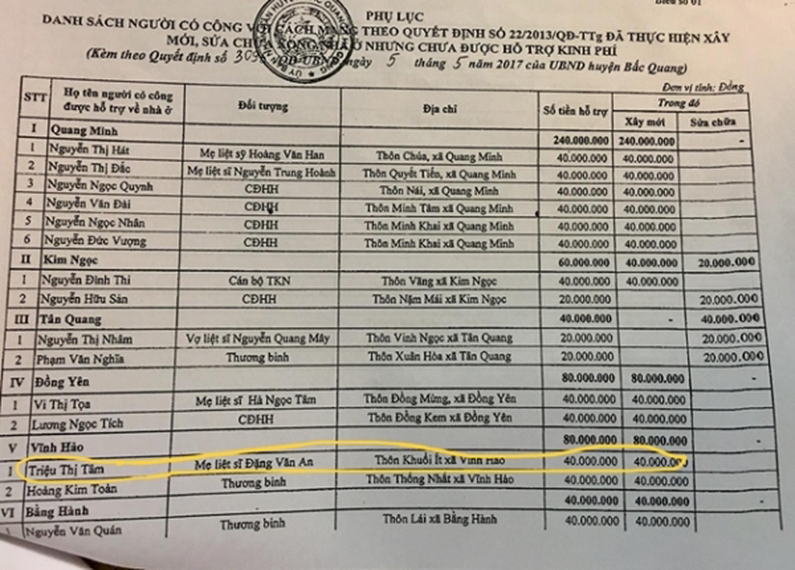 Theo ông Phú, thực hiện Quyết định 22 ngày 26/4/2013 của Thủ tướng Chính phủ về việc hỗ trợ người có công với cách mạng về nhà ở, nhiệm vụ của Phòng LĐ-TB&XH huyện Bắc Quang là phối hợp với các ban, ngành chức năng rà soát, kiểm tra những trường hợp đủ điều kiện để thẩm định. Còn việc thực hiện, giám sát và cấp kinh phí chủ yếu do ngành Xây dựng và UBND xã Vĩnh Hảo.