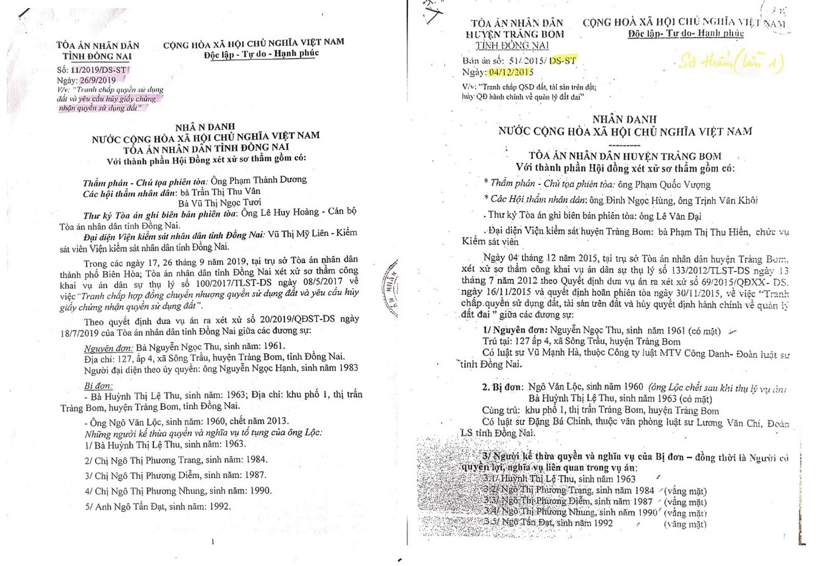 Ngày 4/12/2015, tại Bản án sơ thẩm số 51/2015/DS-ST, TAND huyện Trảng Bom đã tuyên bác đơn yêu cầu khởi kiện của bà Ngọc Thu đối với bà Lệ Thu và những người kế thừa quyền và nghĩa vụ của ông Ngô Văn Lộc; bác yêu cầu khởi kiện của bà Ngọc Thu về nội dung “hủy việc UBND huyện Trảng Bom cấp GCNQSDĐ” đối với 3 thửa đất đã cấp cho vợ chồng bà Lệ Thu.