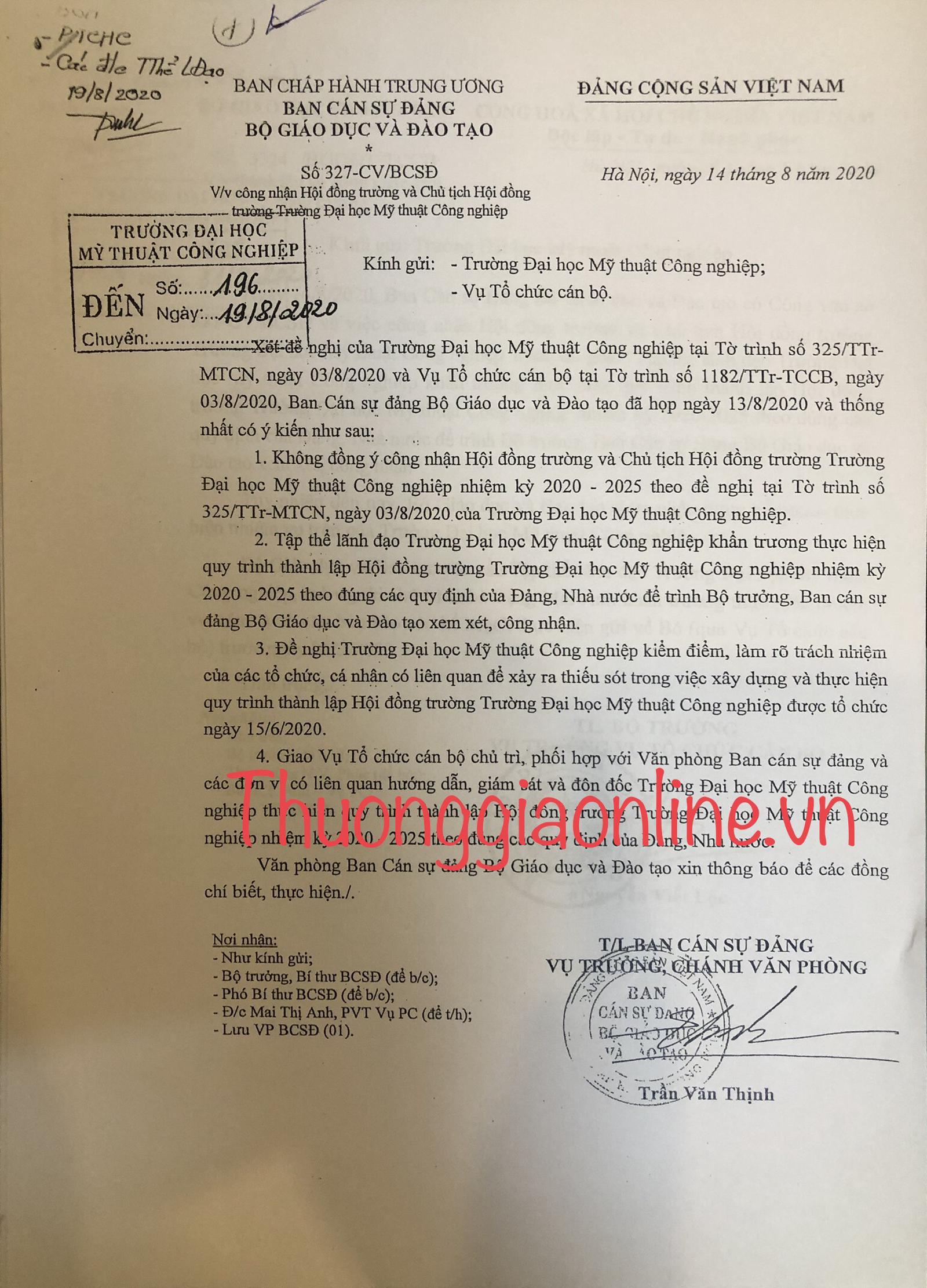 Trước những kiến nghị nêu trên và căn cứ vào báo cáo của tập thể lãnh đạo ĐHMTCN, ngày 14/08/2020 Ban cán sự Đảng Bộ GD&ĐT đã có công văn số 327 không đồng ý công nhận Hội đồng trường và Chủ tịch Hội đồng trường ĐHMTCN nhiệm kỳ 2020 – 2025… Đề nghị ĐHMTCN kiểm điểm, làm rõ trách nhiệm của các tổ chức, cá nhân có liên quan để xảy ra thiếu sót trong việc xây dựng và thực hiện quy trình thành lập Hội đồng trường tổ chức ngày 15/06/2020”.