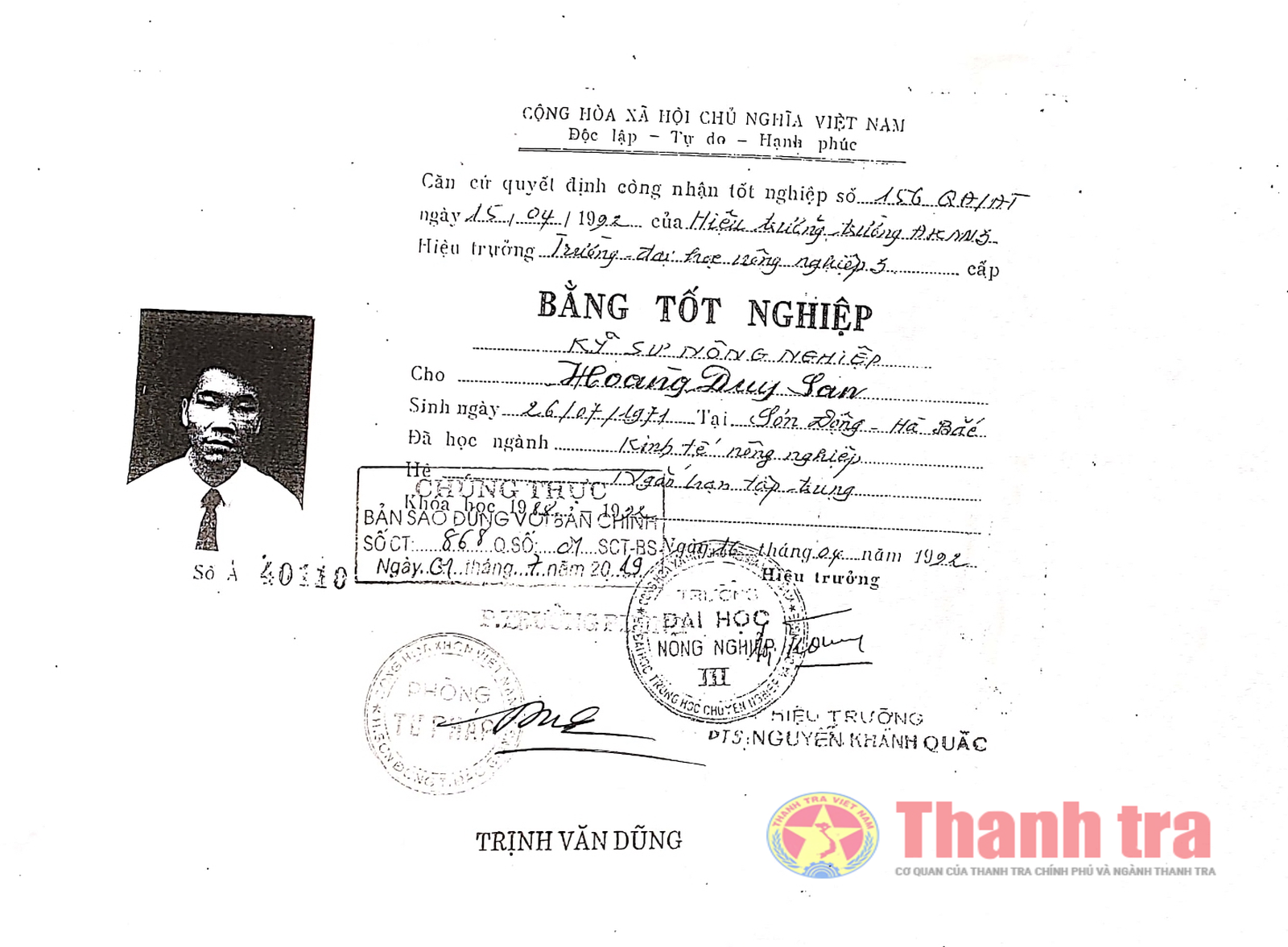 Văn bản số 1275/QLCL-QLVBCC của Cục Quản lý chất lượng, Bộ Giáo dục và đào tạo nêu rõ: “Căn cứ quy định trên, Bằng tốt nghiệp kỹ sư nông nghiệp hệ ngắn hạn tập trung của ông Hoàng Duy San và ông Nguyễn Văn Hùng (bản sao do quý Báo cung cấp) tương đương với Bằng tốt nghiệp cao đẳng”.