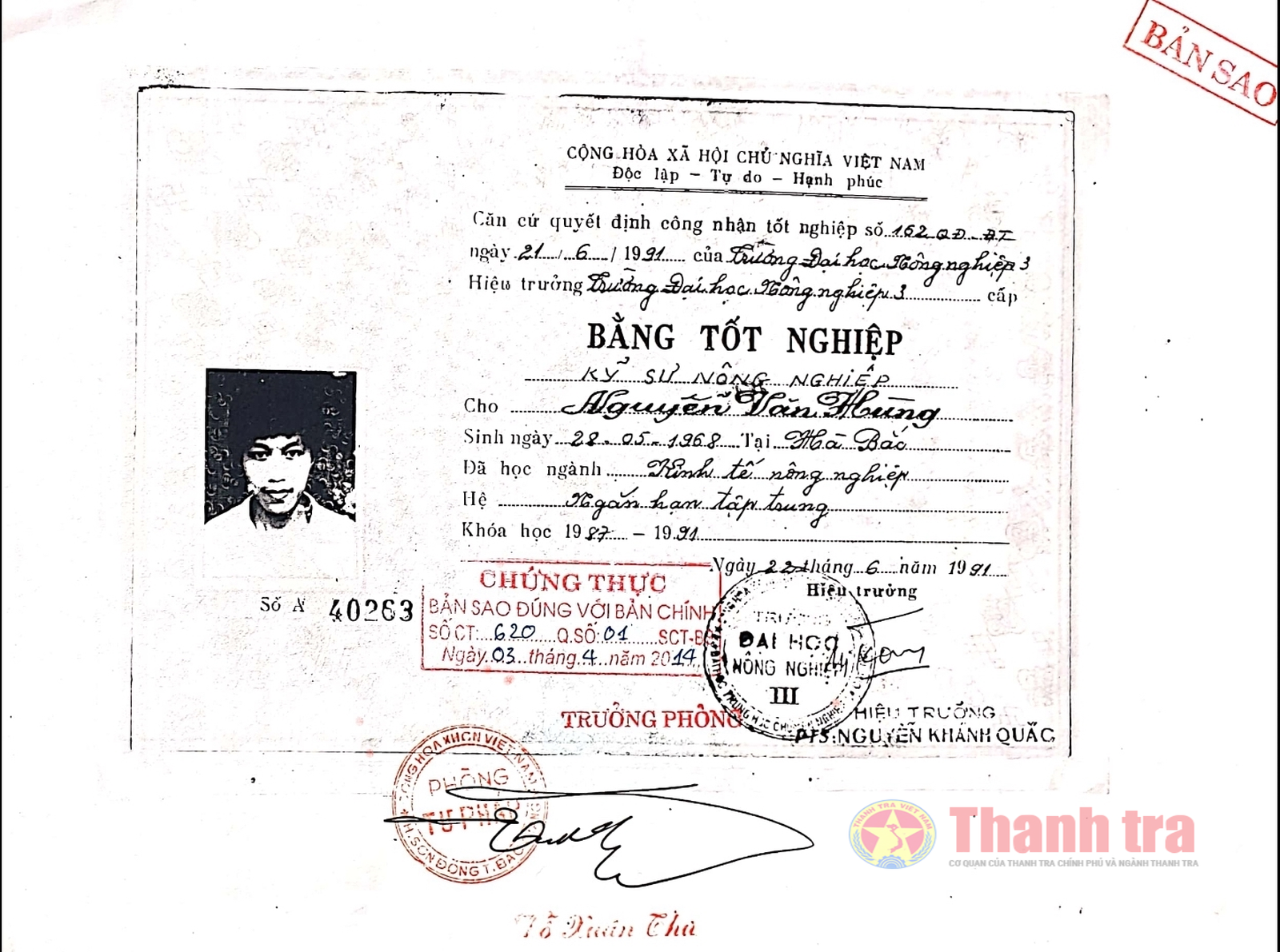 Được biết, ngày 22/6/1991, Trường Đại học Nông nghiệp 3 cấp Bằng tốt nghiệp kỹ sư nông nghiệp cho ông Nguyễn Văn Hùng, sinh ngày 28/5/1968 tại Hà Bắc, đã học ngành Kinh tế nông nghiệp, hệ “ngắn hạn tập trung”, khoá học năm 1987 đến năm 1991.