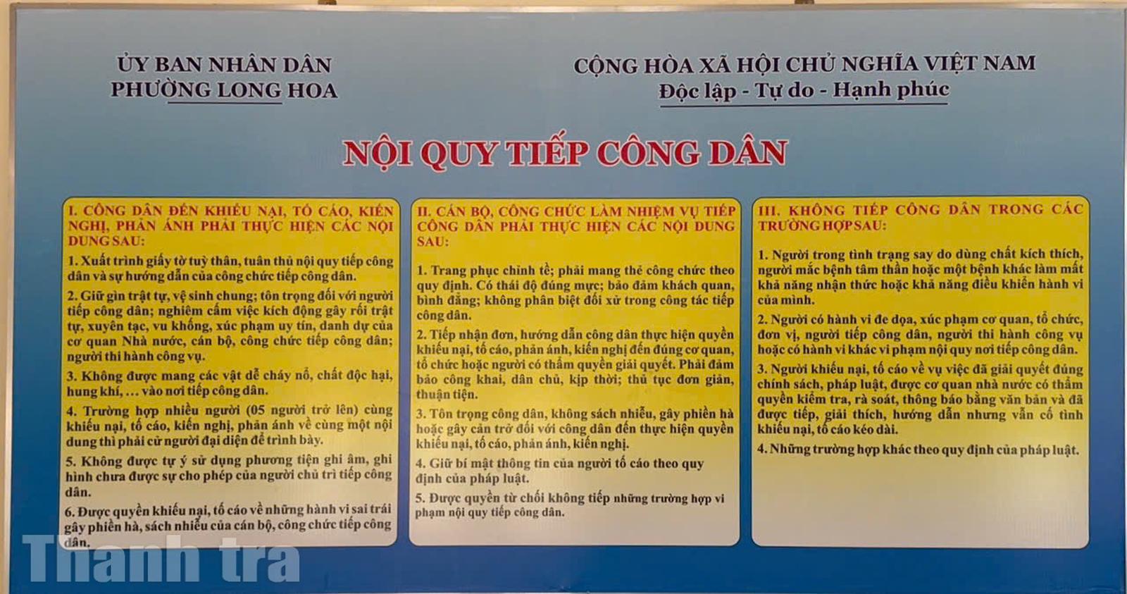 Nội quy tiếp công dân được UBND phường Long Hoa công khai để mỗi người dân đều có thể biết và thực hiện. Ảnh: Thu Huyền
