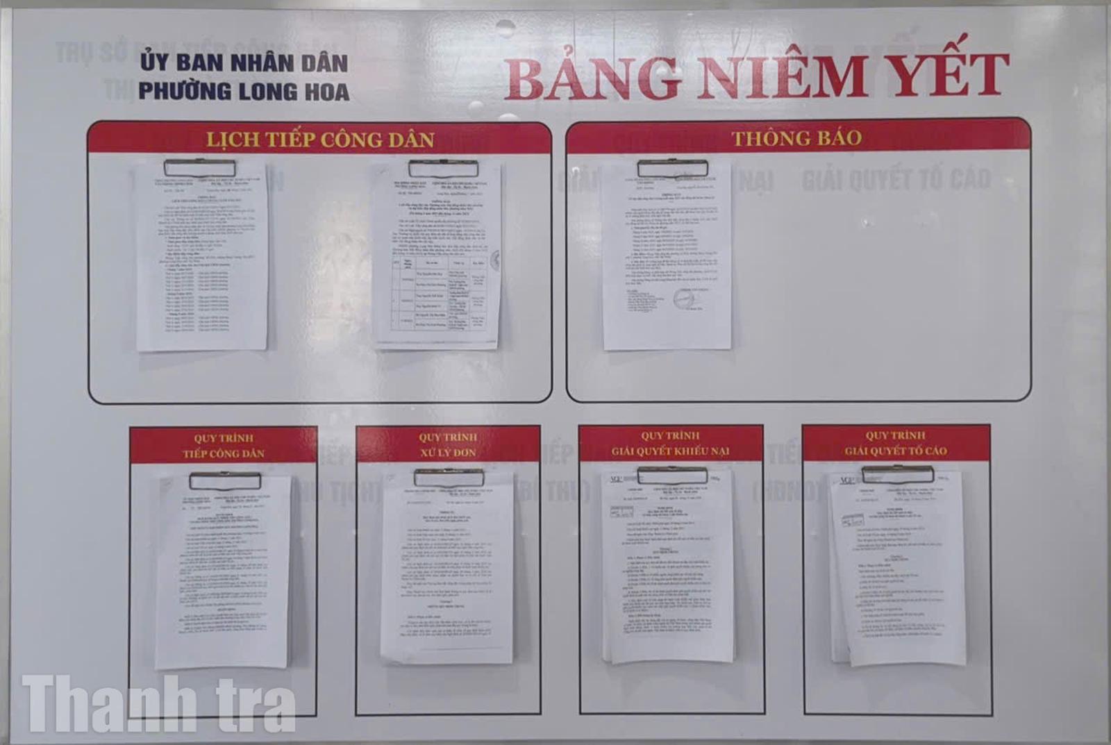 Lịch tiếp công dân và quy trình tiếp công dân, xử lý đơn thư, giải quyết khiếu nại, tố cáo được UBND phường Long Hoa niêm yết công khai. Ảnh: Thu Huyền