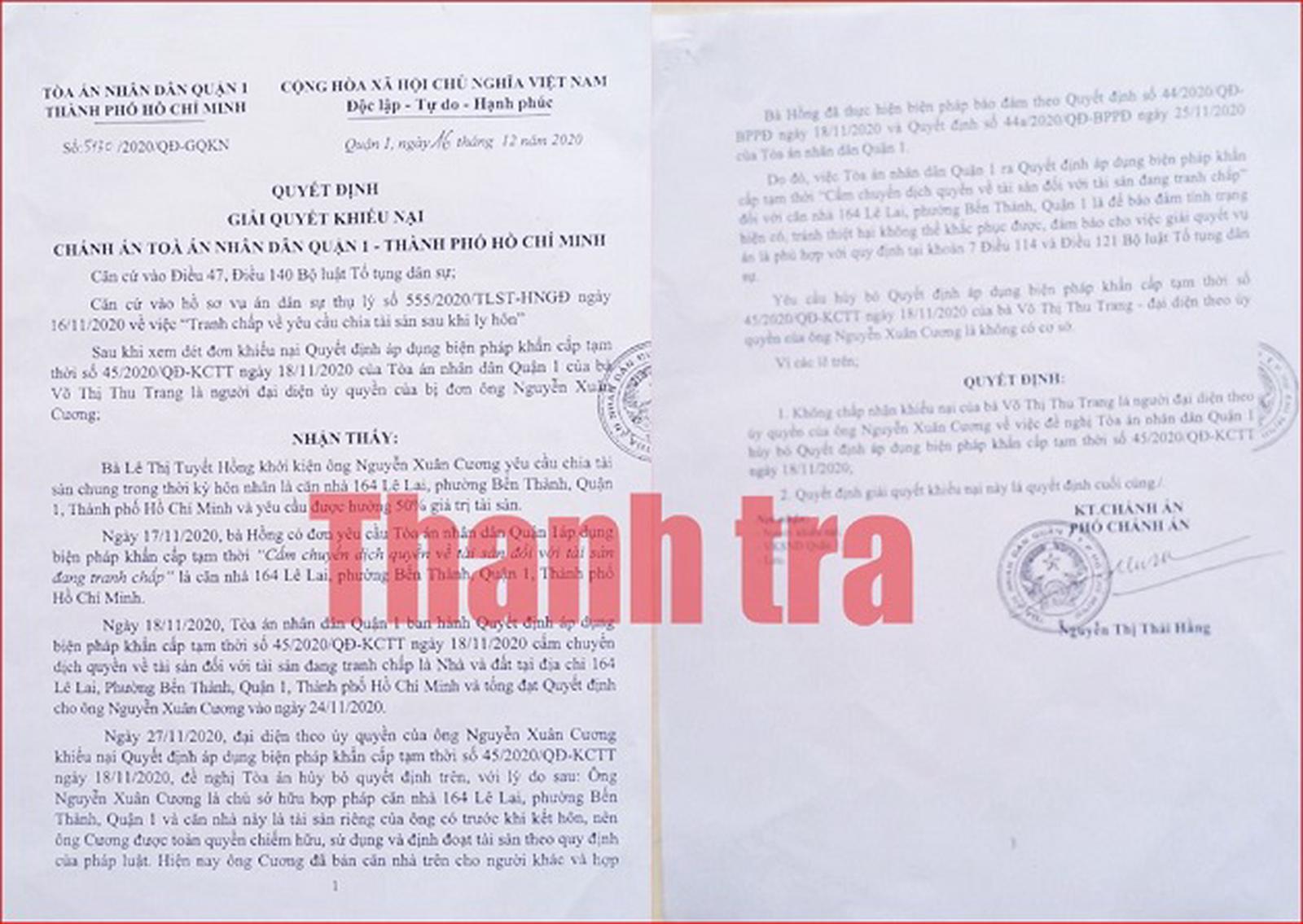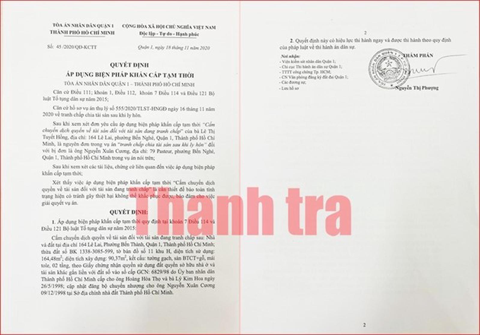 Ngày 18/11/2020, TAND quận 1 đã ra Quyết định số 45/2020/QĐ-KCTT về áp dụng biện pháp khẩn cấp tạm thời “cấm dịch chuyển quyền về tài sản đối với tài sản đang tranh chấp” là nhà và đất tại số 164 Lê Lai, phường Bến Thành, quận 1, theo giấy chứng nhận quyền sử dụng đất, quyền sở hữu nhà ở và tài sản khắc gắn liền với đất do UBND TP Hồ Chí Minh cấp cho ông Hoàng Hòa Thọ và bà Lý Kim Hoa ngày 26/5/1998; cập nhật đăng bộ chuyển nhượng cho ông Nguyễn Xuân Cương ngày 9/12/1998.