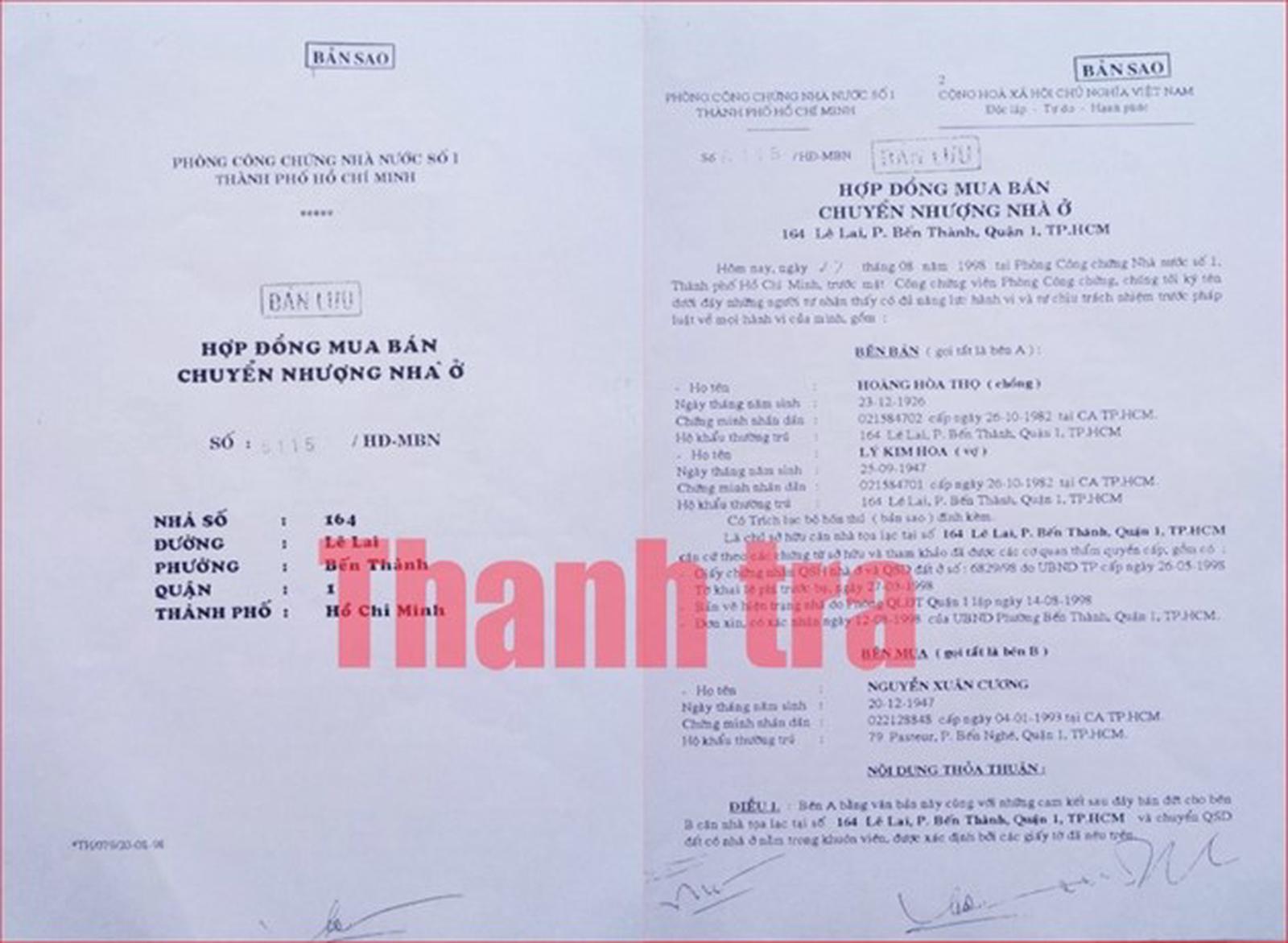 Trước đó, ngày 27/8/1998, ông Cương đã nhận chuyển nhượng căn nhà 164 Lê Lai, phường Bến Thành từ ông Hoàng Hòa Thọ và bà Lý Kim Hoa. Việc chuyển nhượng giữa 2 bên được lập thành hợp đồng mua bán chuyển nhượng nhà ở và được Phòng Công chứng Nhà nước số 1, TP Hồ Chí Minh công chứng.