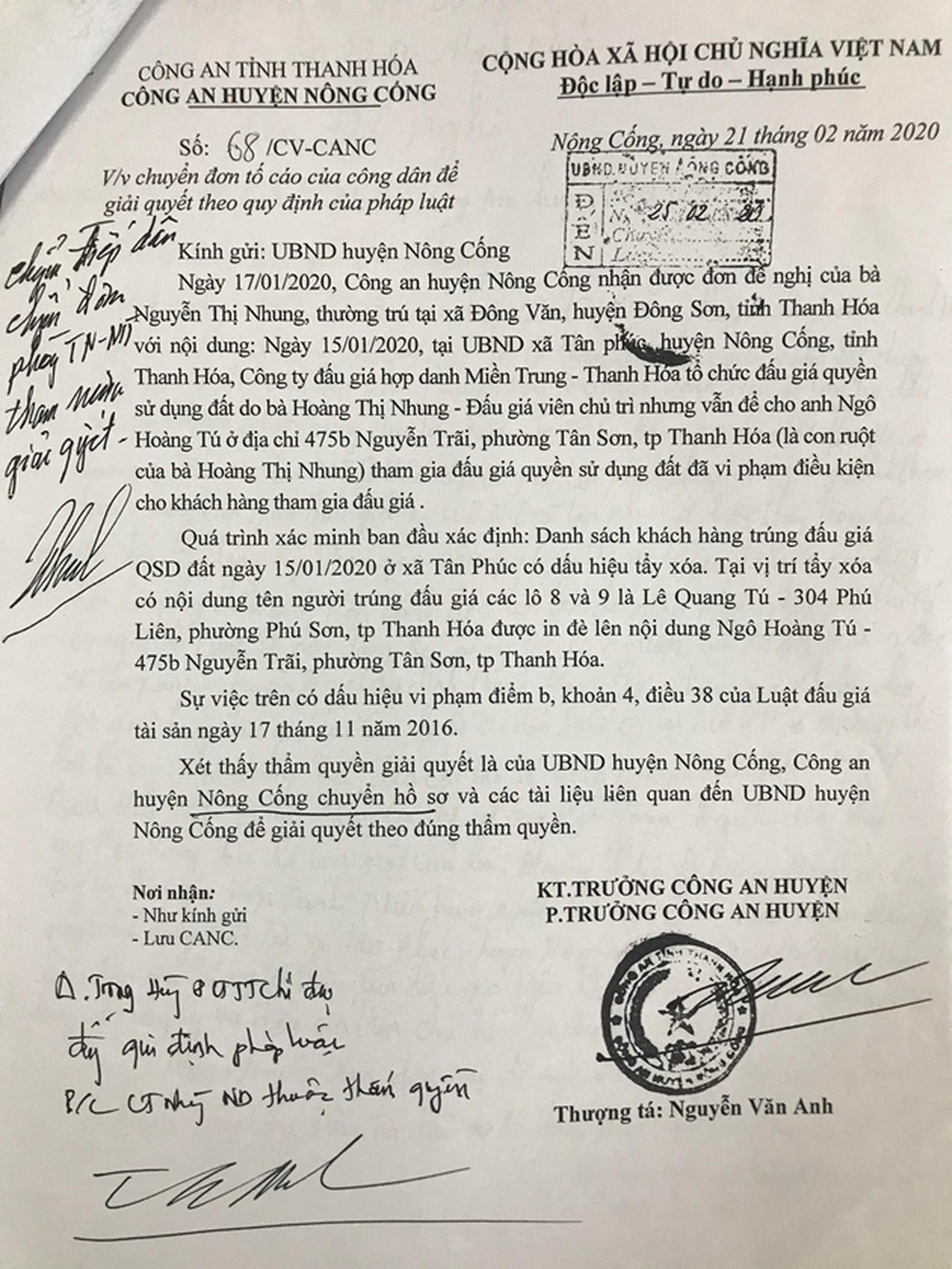 Ngay sau đó, Công an huyện Nông Cống đã tiến hành xác minh, ngày 21/2/2020 có Văn bản số 68/CV-CANC gửi đến UBND huyện Nông Cống nêu rõ: Quá trình xác minh ban đầu, danh sách khách hàng trúng đấu giá QSDĐ ngày 15/1/2020 ở xã Tân Phúc có dấu hiệu tẩy xóa. Tại vị trí tẩy xóa có nội dung tên người trúng đấu giá các lô 8 và 9 là Lê Quang Tú, 304 Phú Liên, phường Phú Sơn, TP Thanh Hóa được in đè nội dung Ngô Hoàng Tú, 475b Nguyễn Trãi, phường Tân Sơn, TP Thanh Hóa. Sự việc trên có dấu hiệu vi phạm điểm b, khoản 4, điều 38 của Luật Đấu giá ngày 17/11/2016.