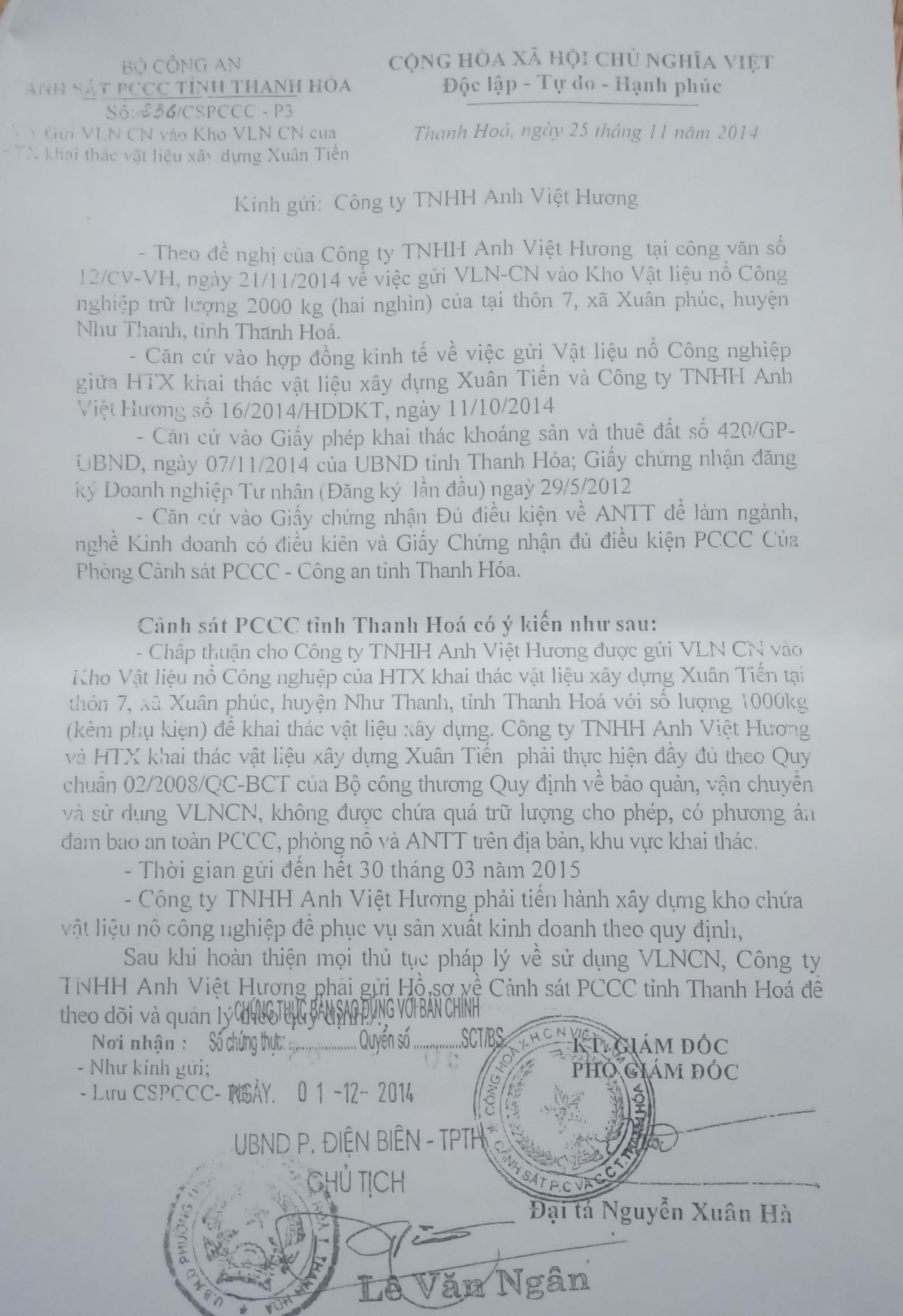 Theo thông tin mà chúng tôi nhận được, trong quá trình xác minh theo đơn thư tố cáo của công dân, Công an huyện Như Thanh đã có Công văn 1579/CANT gửi Phòng Cảnh sát PCCC và CNCH Công an tỉnh đề nghị phối hợp cung cấp hồ sơ, tài liệu “Hợp đồng kinh tế về việc gửi vật liệu nổ công nghiệp giữa HTX Xuân Tiến và Công ty TNHH Anh Việt Hương số 16/2014/HĐKT ngày 11/10/2014” để xác minh, giải quyết đơn thư tố cáo của công dân. Tuy nhiên, đơn vị này lại có văn bản cho rằng qua khai thác hồ sơ lưu trữ, không tìm thấy tài liệu này. Trong khi đó, ngày 21/11/2014 phòng Cảnh sát PCCC thuộc Bộ Công an nay là phòng Cảnh sát PCCC đã căn cứ vào hợp đồng kinh tế về việc gửi Vật liệu nổ Công nghiệp giữa HTX Xuân Tiến và Công Ty TNHH Anh Việt Hương số 16/2014/HĐKT ngày 11/10/2014 chấp thuận cho Công ty Anh Việt Hương được gửi 1.000kg vật liệu nổ vào kho của HTX Xuân Tiến.