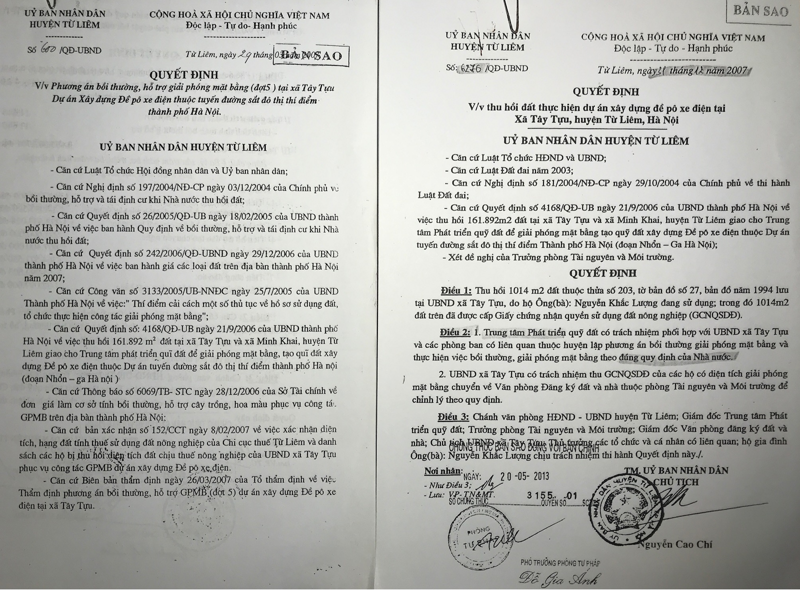 Ngày 21/9/2006 UBND TP Hà Nội đã ban hành Quyết định số 4168/QĐ- UBND về việc thu hồi 161.892 m2 đất tại các xã: Tây Tựu và Minh Khai, huyện Từ Liêm, giao Trung tâm Phát triển quỹ đất để GPMB, tạo quỹ đất xây dựng Đề pô xe điện thuộc Dự án Tuyến đường sắt đô thị thí điểm TP Hà Nội (đoạn Nhổn - ga Hà Nội). Quyết định số 4168 đã có hiệu lực pháp luật kể từ ngày ký, ngày 21/9/2006.