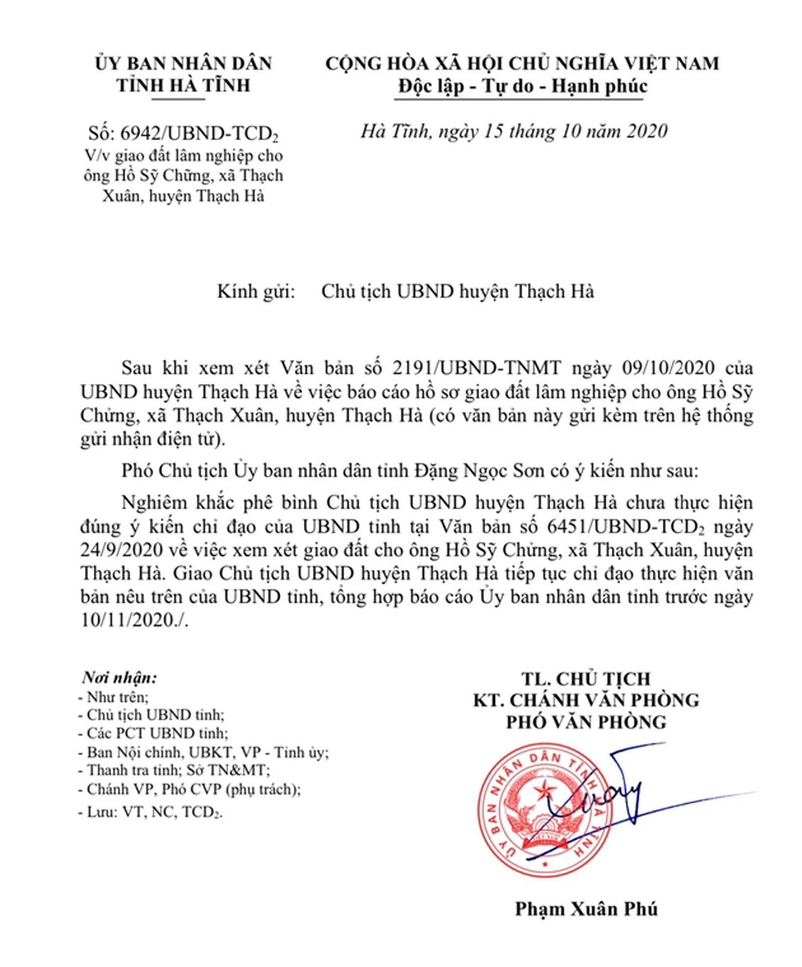 Trước đó, ngày 15/10/2020, UBND tỉnh Hà Tĩnh có Văn bản số 6942/UBND-TCD2 về việc giao đất lâm nghiệp cho ông Hồ Sỹ Chửng gửi Chủ tịch UBND huyện Thạch Hà. Phó Chủ tịch UBND tỉnh Đặng Ngọc Sơn đã nghiêm khắc phê bình Chủ tịch UBND huyện Thạch Hà (ông Trần Việt Hà) chưa thực hiện ý kiến chỉ đạo của UBND tỉnh tại Văn bản số 6451/UBND-TCD2 ngày 24/9/2020 về việc xem xét giao đất cho ông Hồ Sỹ Chửng; giao Chủ tịch UBND huyện Thạch Hà tiếp tục chỉ đạo thực hiện văn bản nêu trên của UBND tỉnh, tổng hợp báo cáo UBND trước ngày 10/11/2020.