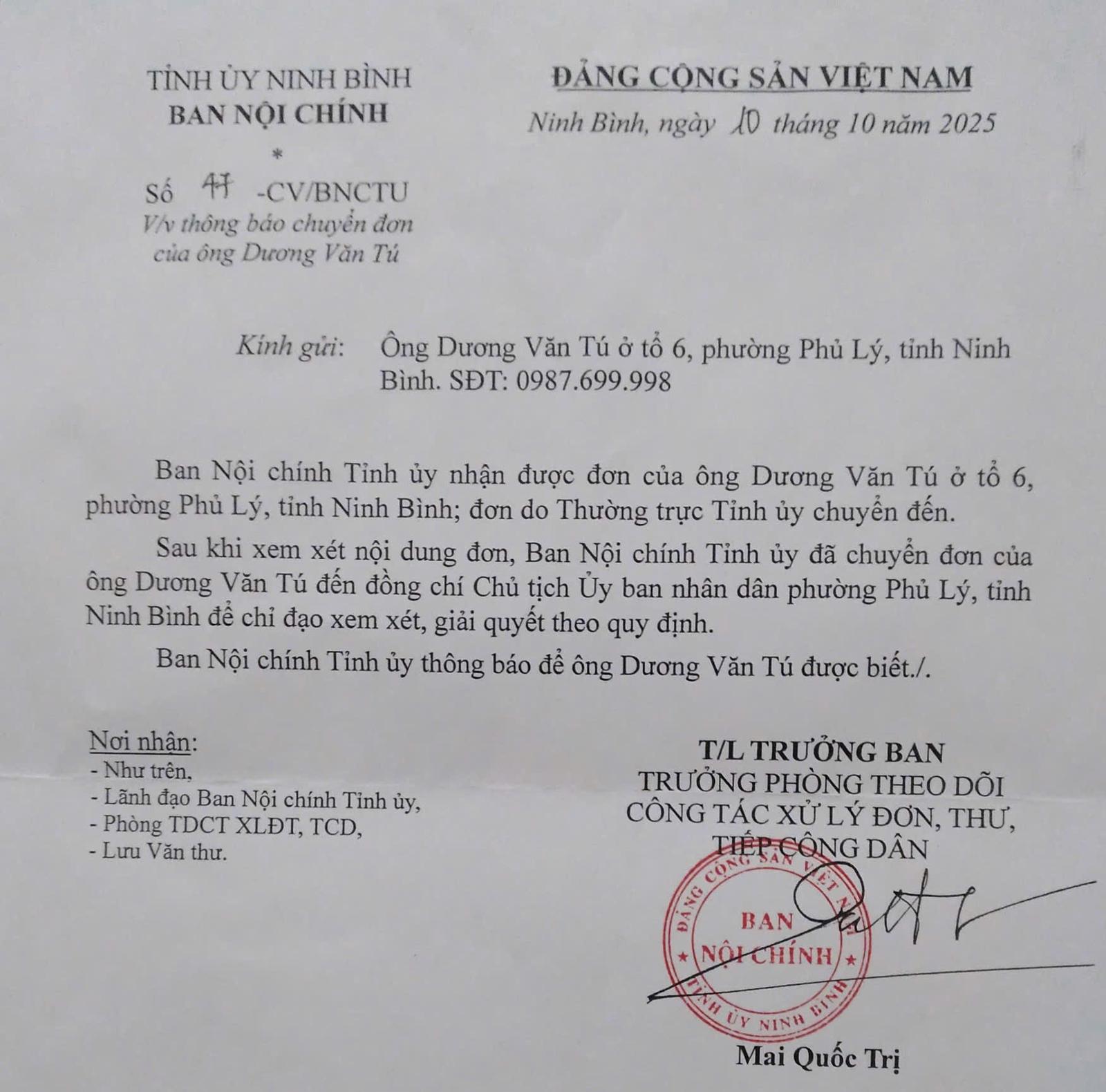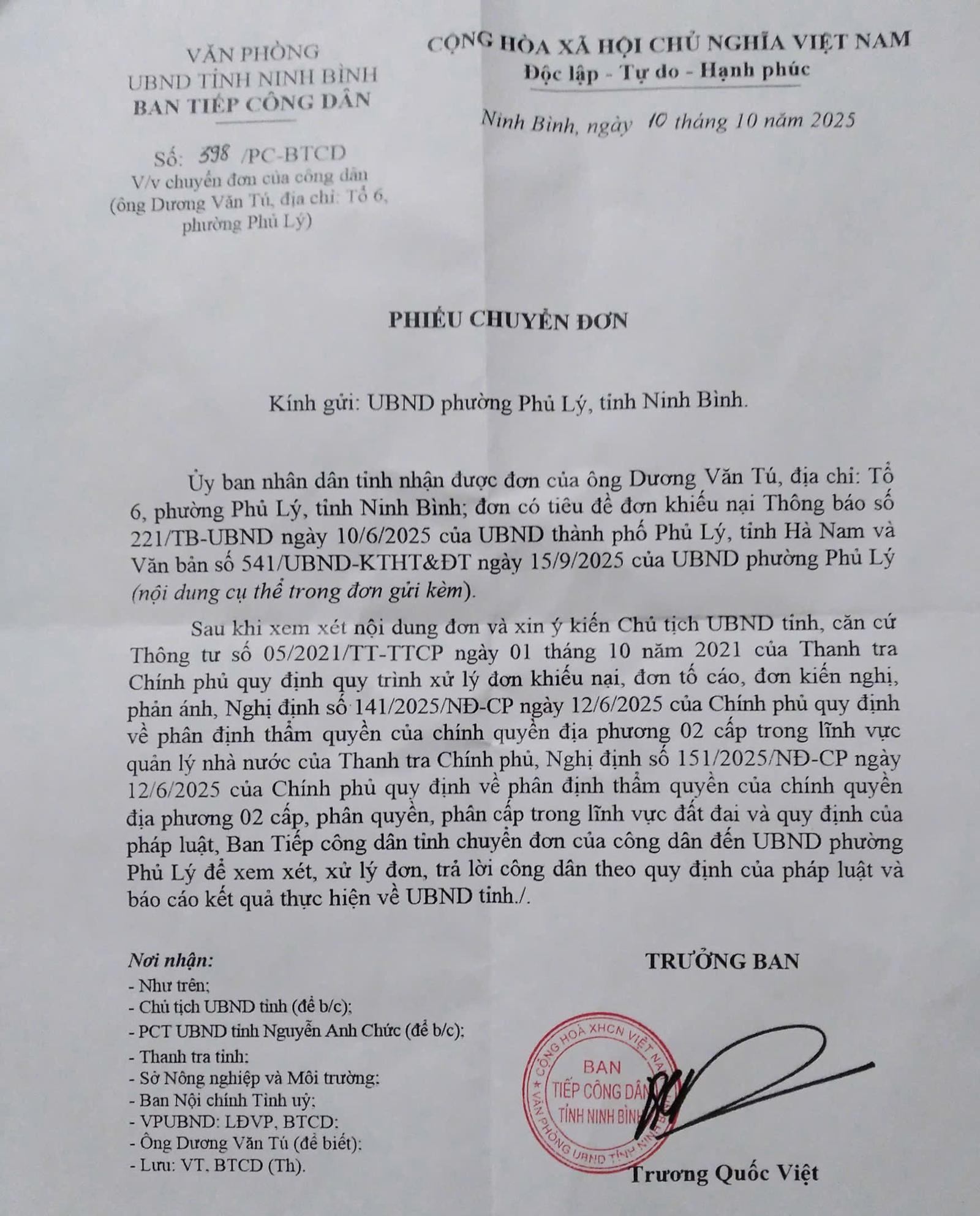 Ngày 10/10/2025, Ban Tiếp công dân tỉnh Ninh Bình có Phiếu chuyển đơn số 598/PC-BTCD về việc chuyển đơn của công dân gửi UBND phường Phủ Lý, tỉnh Ninh Bình.